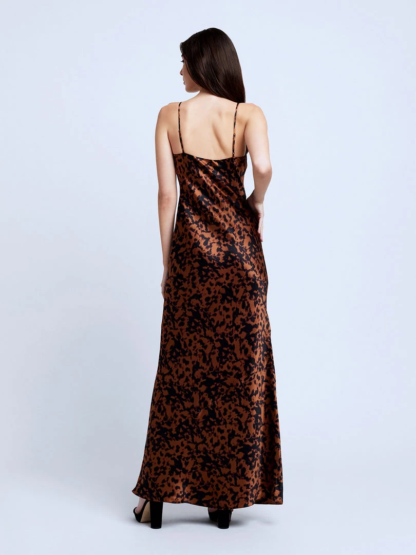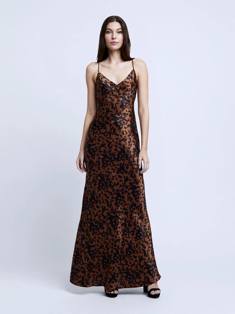 An effortlessly elegant maxi slip dress. A clean V-neckline hangs from adjustable spaghetti straps. Black-and-brown tortoise shell-print silk charmeuse skims over curves, creating a slinky silhouette. No closures. 100% Silk.