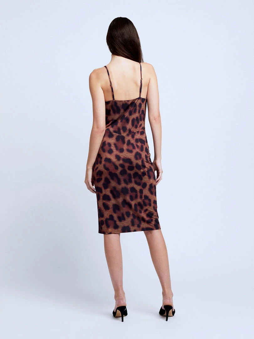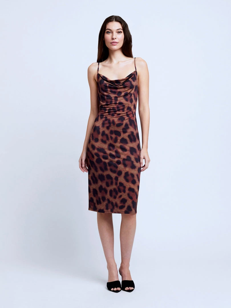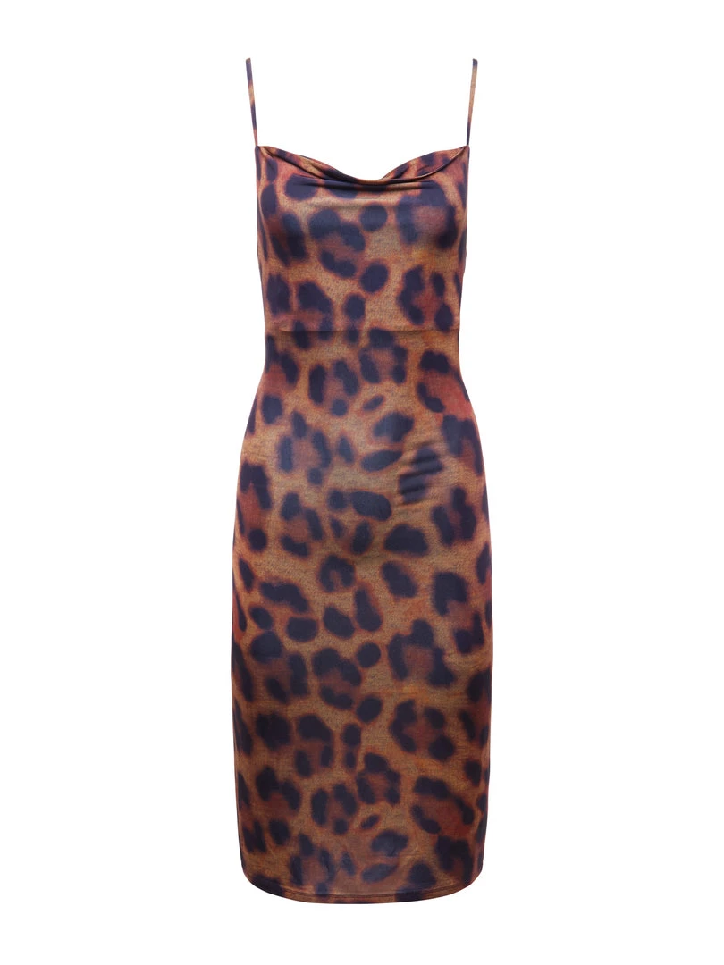 A stunning slip dress with a spotted panther print in black and spice-brown hues. Jersey fabric and cowl front drape gracefully, clinging beautifully to the body. Style tapers to the waist then falls straight to a knee-grazing hem. Adjustable spaghetti straps and no closures.