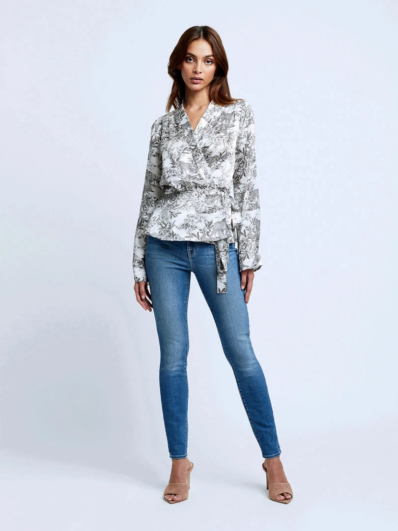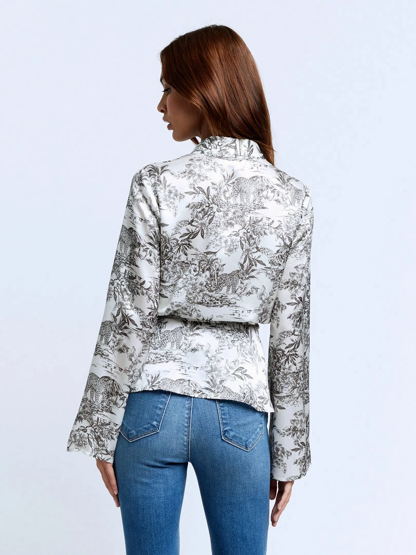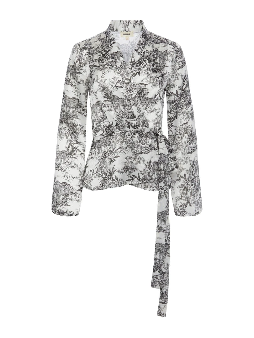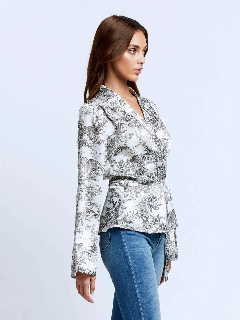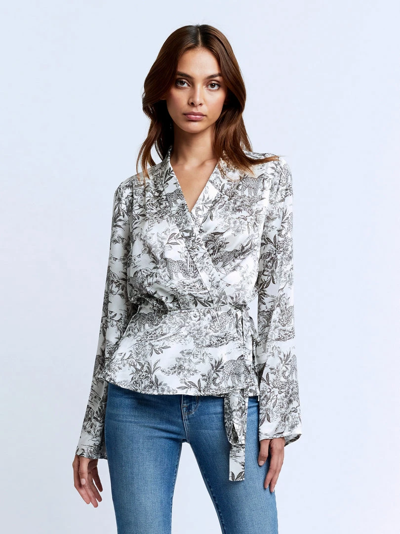 A sublime silk wrap blouse with a black jungle-safari print set against an ivory background. Graceful wrap design with peplum fastens at side front with sash ties, encouraging hourglass definition. Finished with subtly flared long sleeves. 100% Silk.