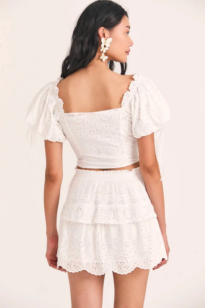 Our Charmaine Skirt is day-to-night in a new soft fabric with an intricate mix of contrast floral eyelet embroidery. This easy miniskirt has an elastic waistband, a short lace-trimmed flounce midway down and a scalloped bottom hem.Â