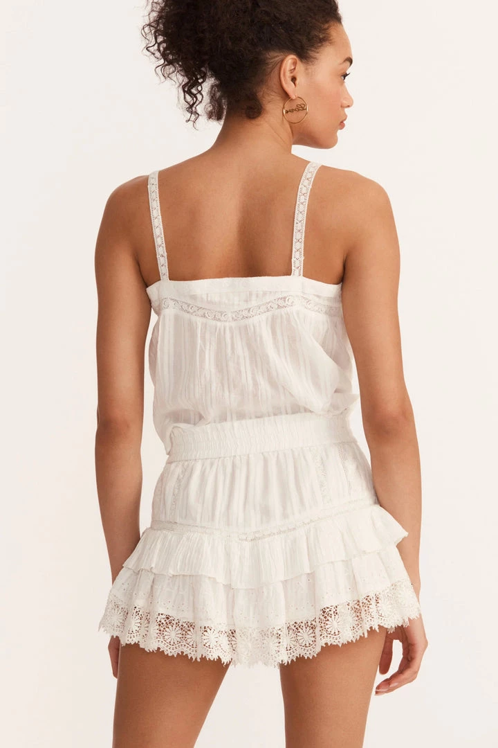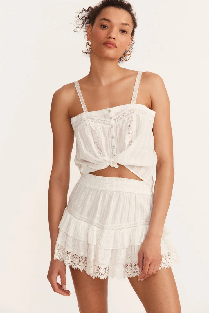 The Tanisha Skirt makes waves in 100% cotton. A hero Victorian, this mini features an elastic waistband at the top and eyelet detailing with custom crochet lace. Finished with a cute tucking detail with slight ruffles.