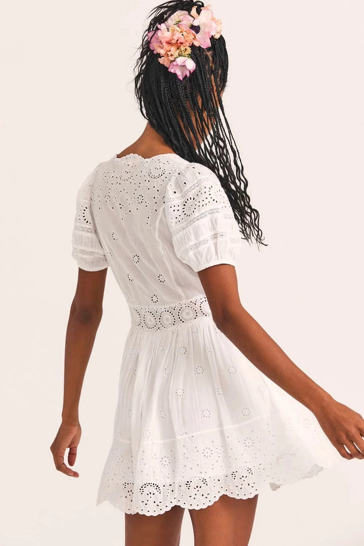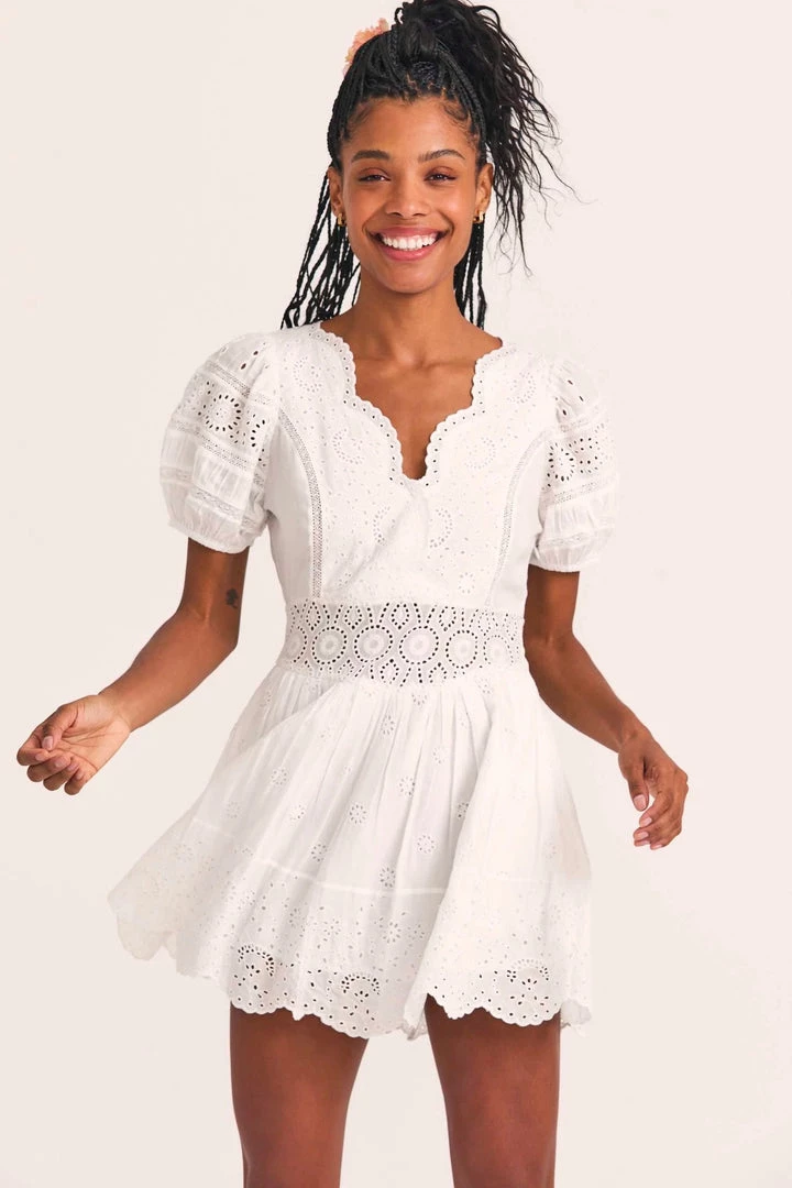 Meet our Valente Dress, a new silky favorite with a mix of eyelet embroidery and inset lace. This frock features puffed sleeves with elastic at opening, a shaped scallop-edged neckline that plunges to an overlap at front and an ornate waistband. The full sweep miniskirt is shirred with a scalloped bottom hem.