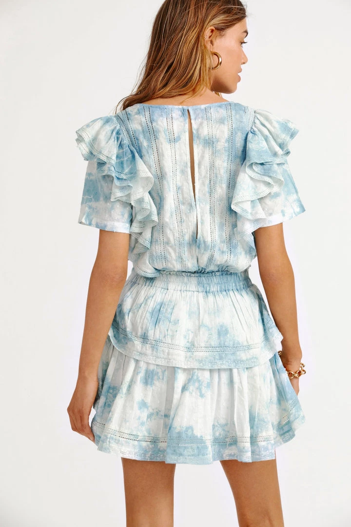 The Natasha Dress returns in 100% polkadot dobby cotton. This easy frock features double ruffled flutter sleeves, which cascade down the front and back of the body to highlight the elasticated waist. Intricate custom lace panels are inset and trim the skirt’s flounces. Shown here in Pacific Indigo Hand Dye.