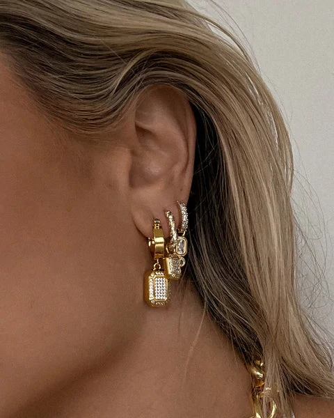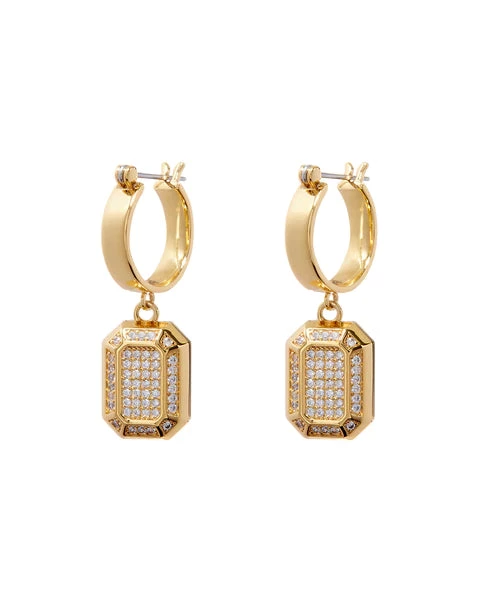 - Pair of flat metal hoops with an emerald shaped, pavè covered charm