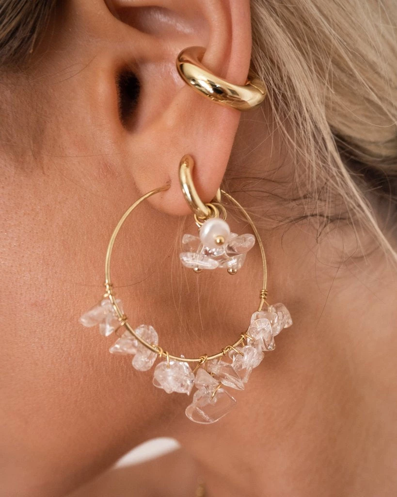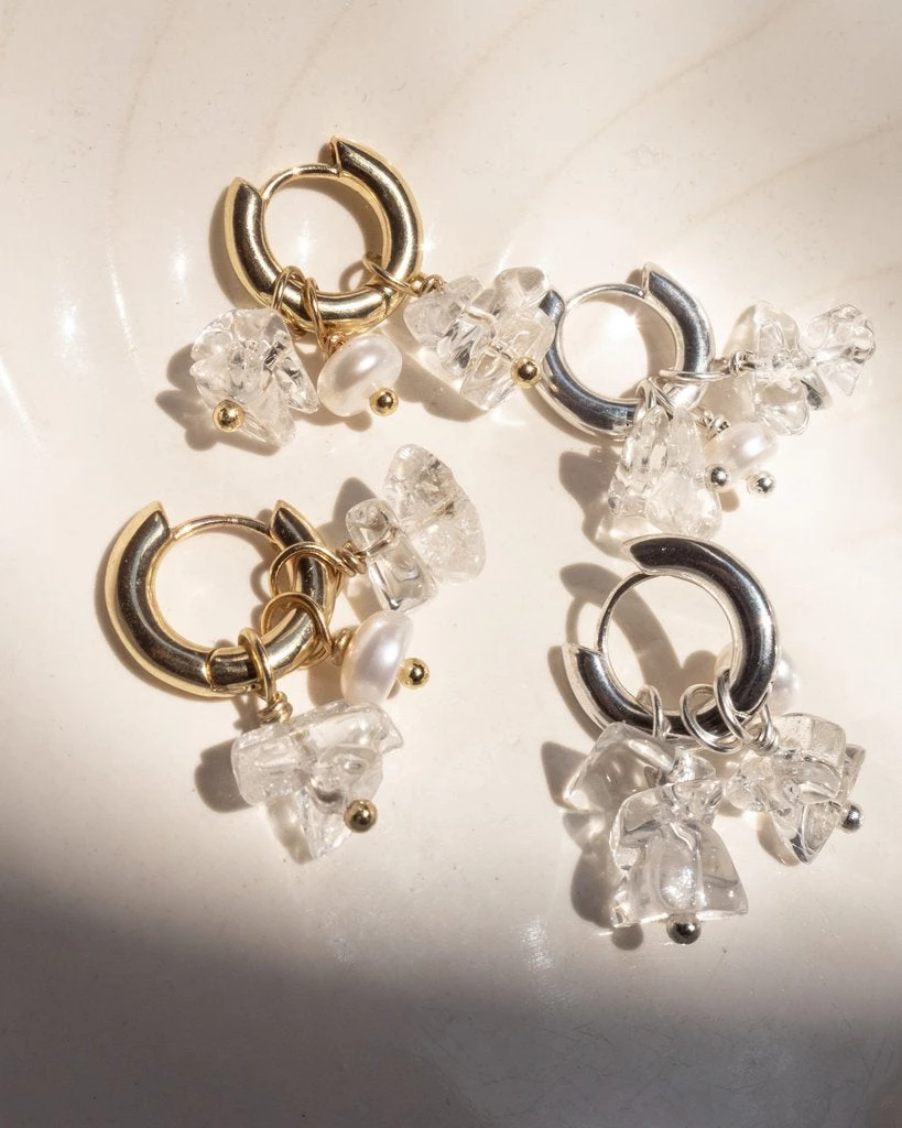 - Pair of metal huggies with glass bead + pearl charms