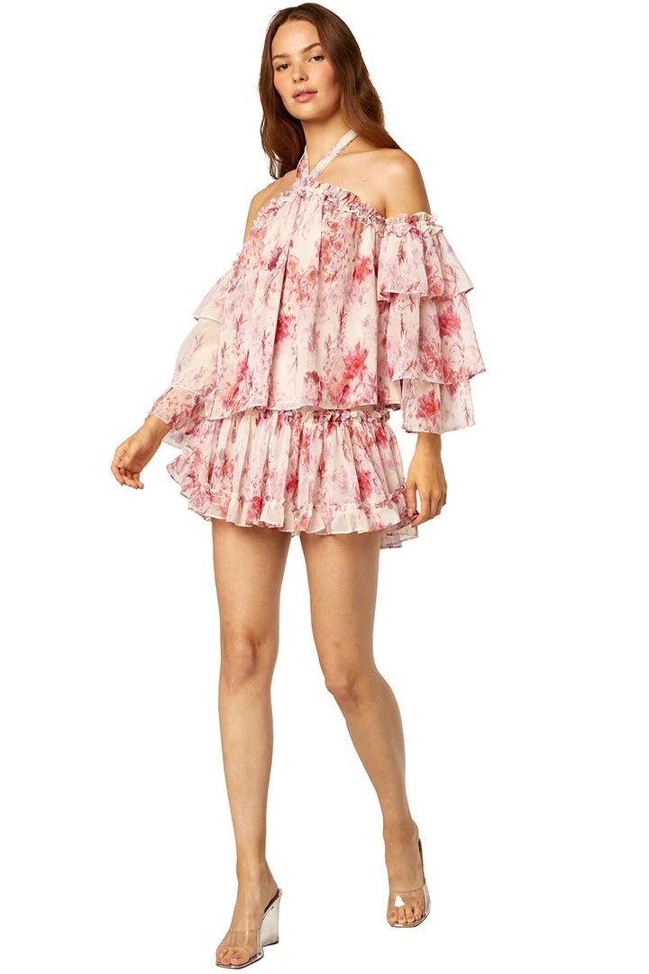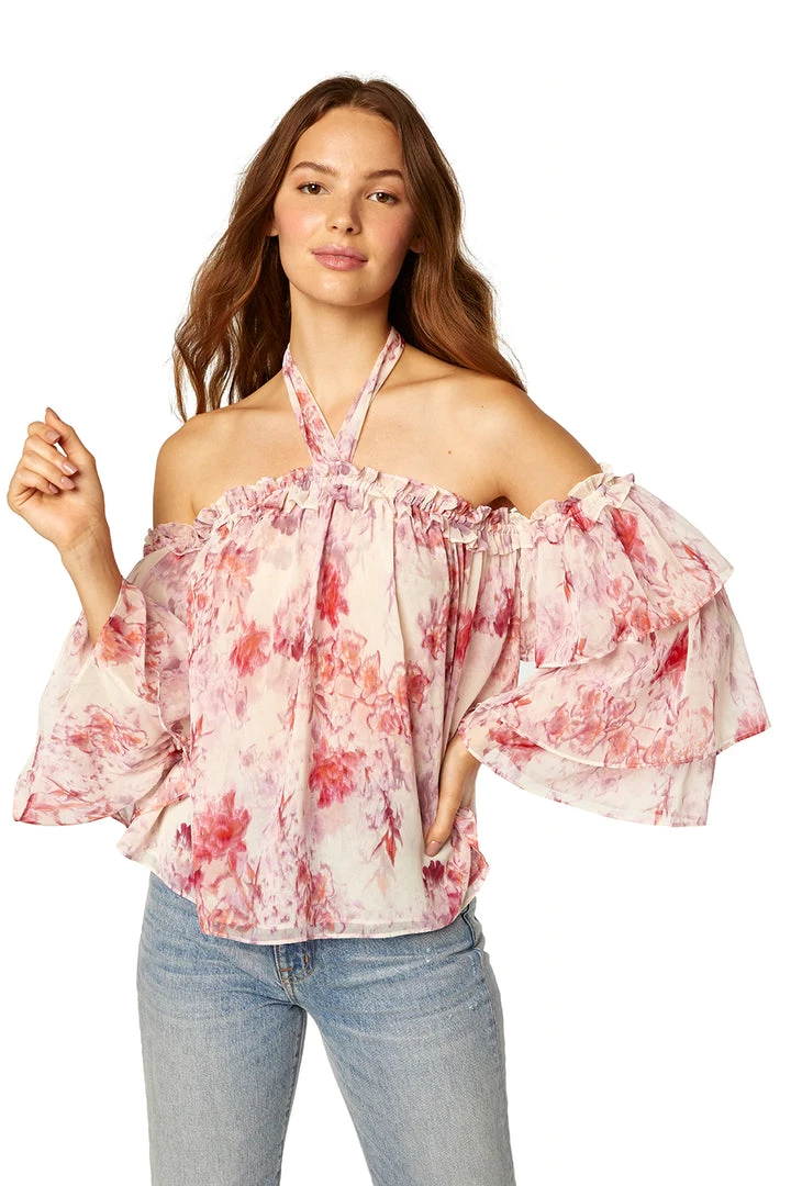 This off-the-shoulder beauty is cut in romantic layers of abstract rose flora chiffon. The elasticated neckline and optional halter tie gives full support. An effortless and feminine blouse to pair back to the coordinating Riane Skirt or wear over denim.