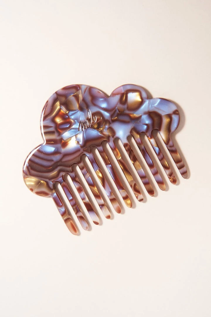 This iridescent wide tooth comb looks as good as it feels in your hand and hair. Featuring periwinkle, gold, and deep mauve tones. Inspired by the magic of the heavens above.