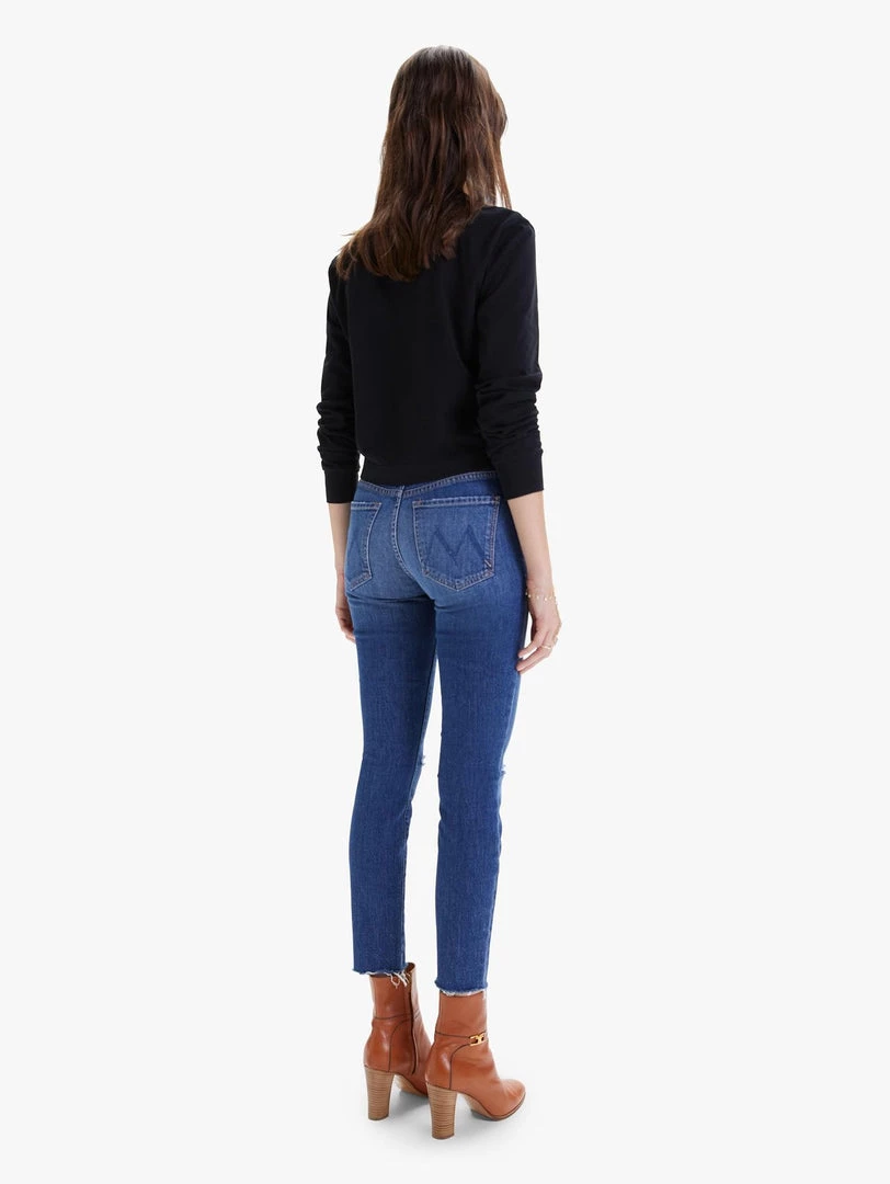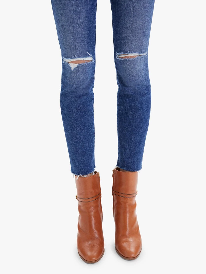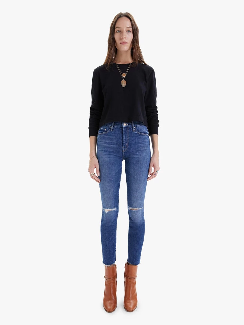 This cult-favorite skinny has a high rise with an ankle-length inseam and a frayed hem. In a classic dark blue wash with holes at the knees and just a touch of stretch.