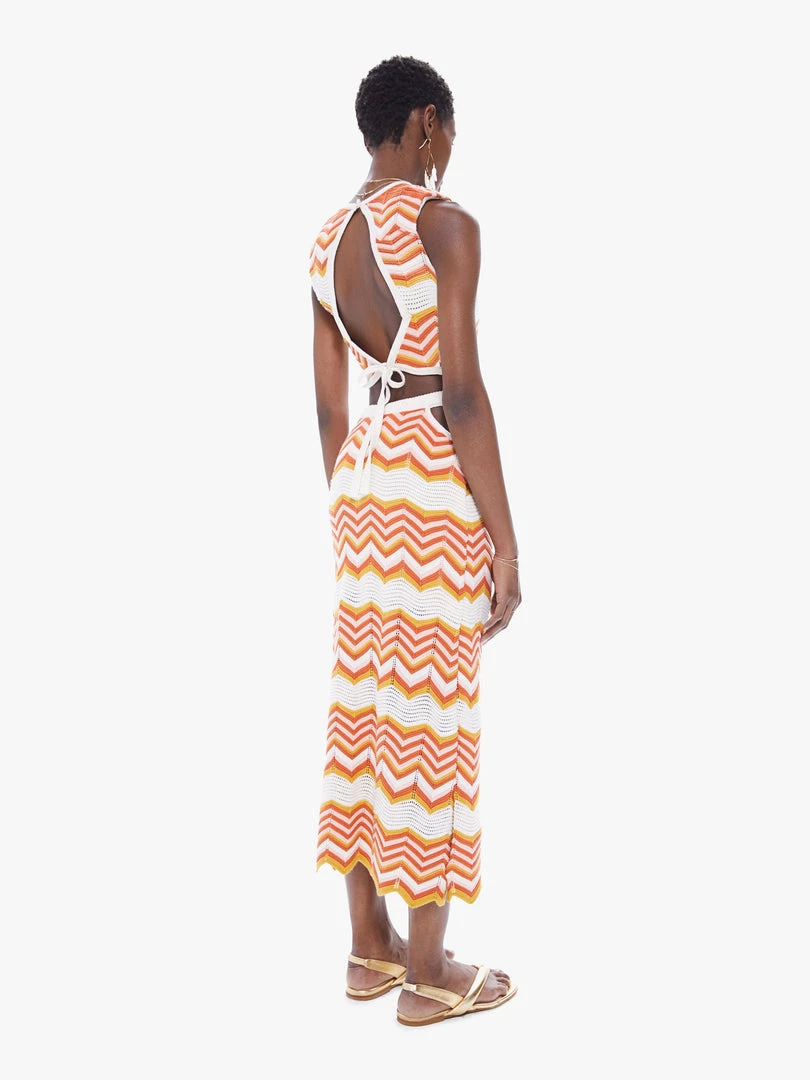 Throwing shade. A high-waisted knit skirt with an elastic waist, cut-outs at the hips and a calf-length hem. Crafted from a stretchy cotton blend, At The Cabana is a white, orange and pink zig-zag stripe print with knit details throughout.Â