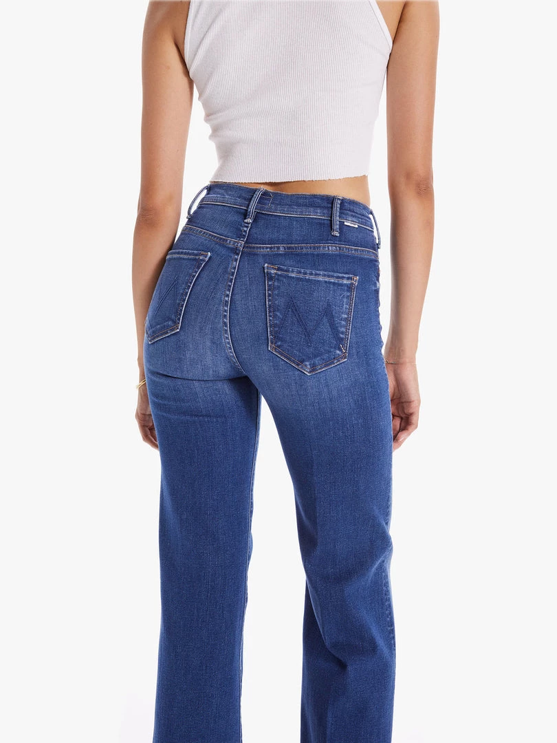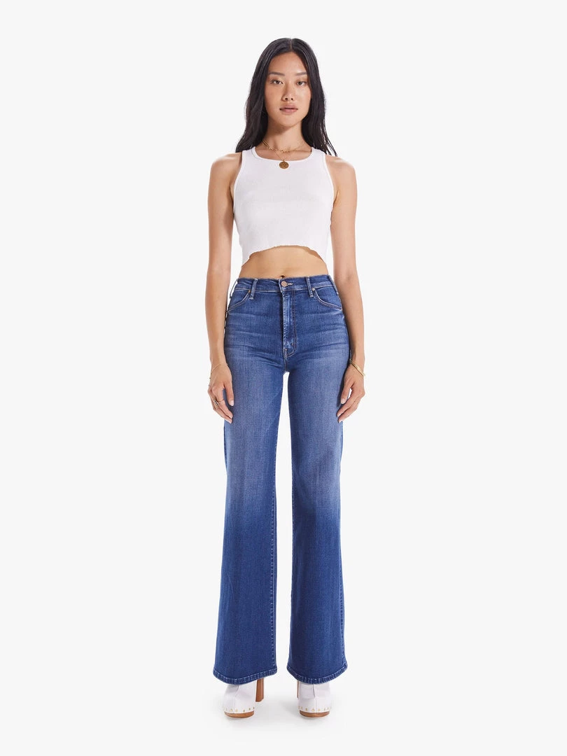 On the record. 70s-inspired wide leg jeans with a high rise, 31-inch inseam and a clean hem. High Fidelity is a comfortable stretch denim in a mid-blue hue crafted from a blend of organic cotton and recycled polyester.