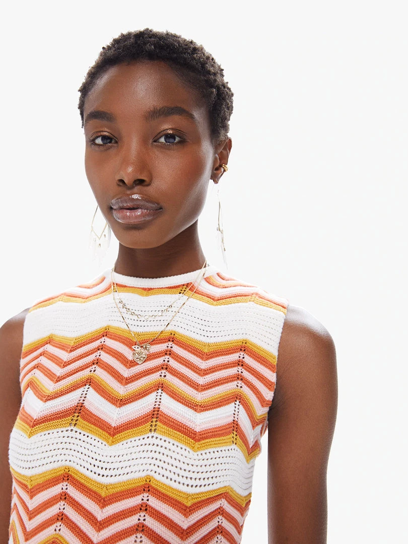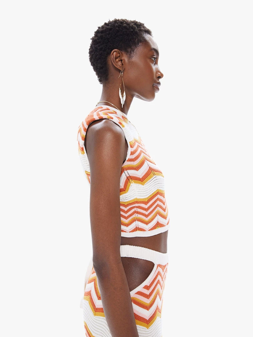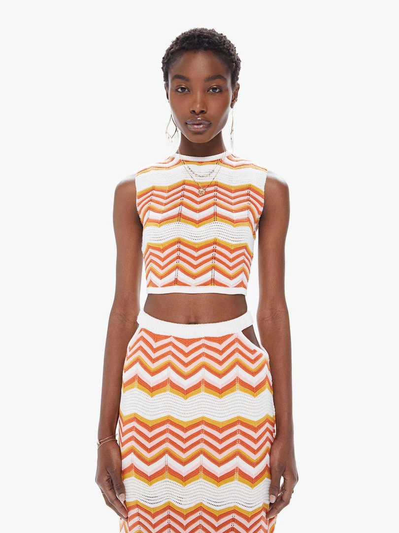 Throwing shade. A cropped knit tank with an open back that buttons at the neck and ties at the waist. Crafted from a stretchy cotton blend, At The Cabana is a white, orange and pink zig-zag stripe print with knit details throughout.Â