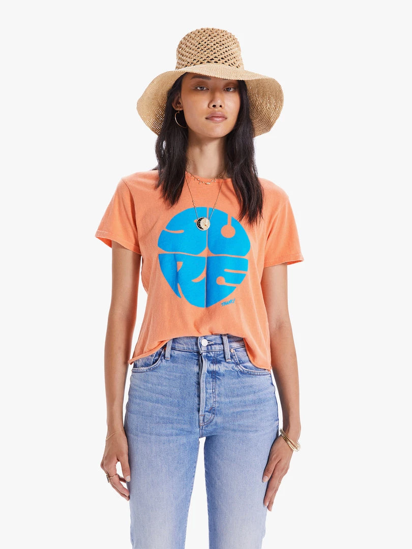 A sure thing. A boxy crewneck with short sleeves and a raw cropped hem. Made from a blend of recycled cotton in an orange hue, the soft, lightweight tee features bright blue text in a graphic, circular shape.