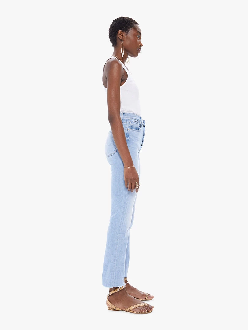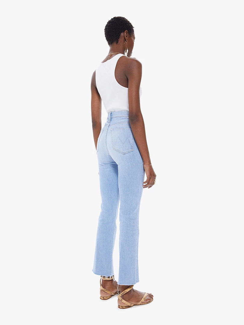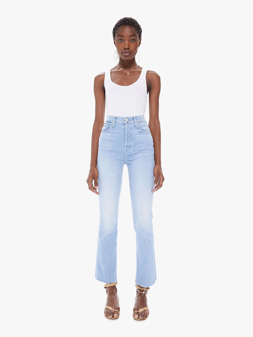 High tides, good vibes. An ultra high-rise flare with a button fly and frayed hem that hits at the ankle. Cut from stretch denim, Island Time is a sun-bleached light-blue hue with whiskering and fading.