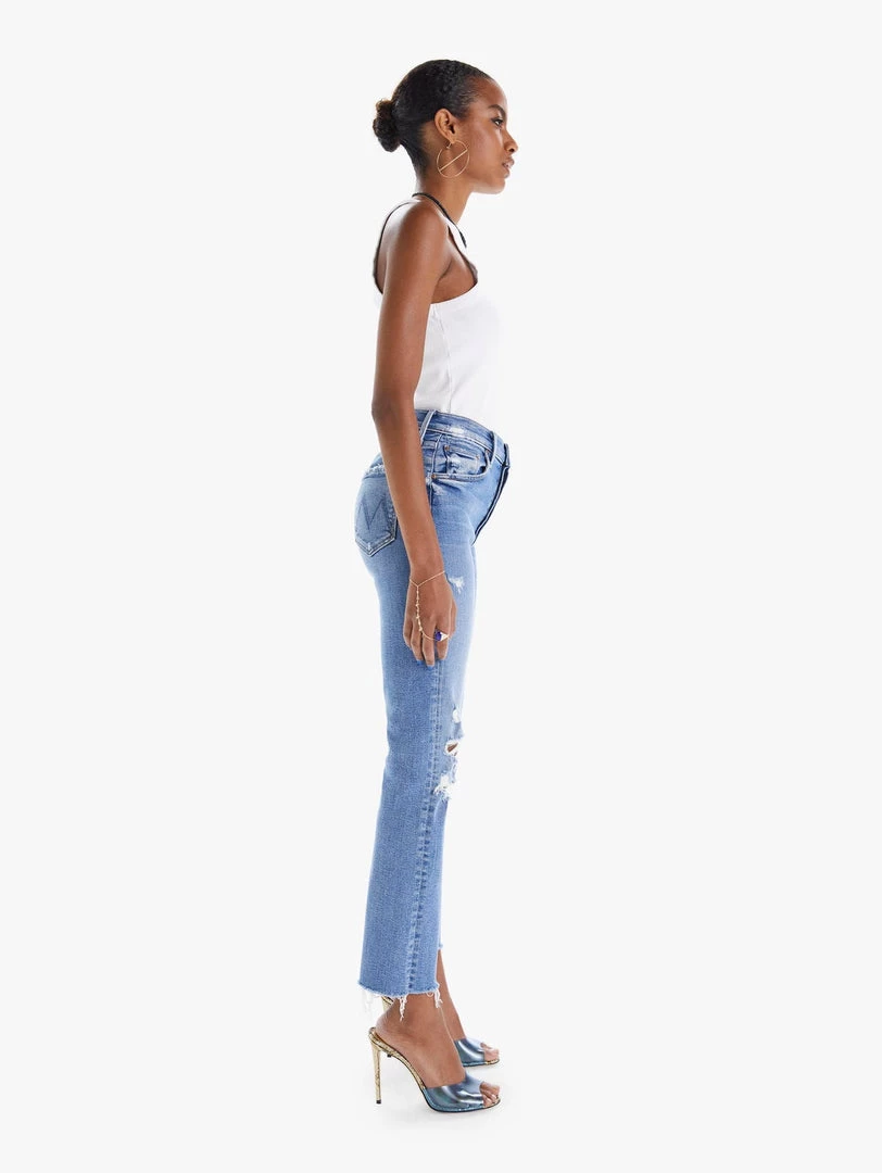Walk the plank. An ultra high-rise flare with a button fly and a frayed hem that hits at the ankle. Cut from comfortable stretch denim, Play Like A Pirate is a weathered mid-blue hue with whiskering, fading and rips at the knees. High seas, high stakes.
