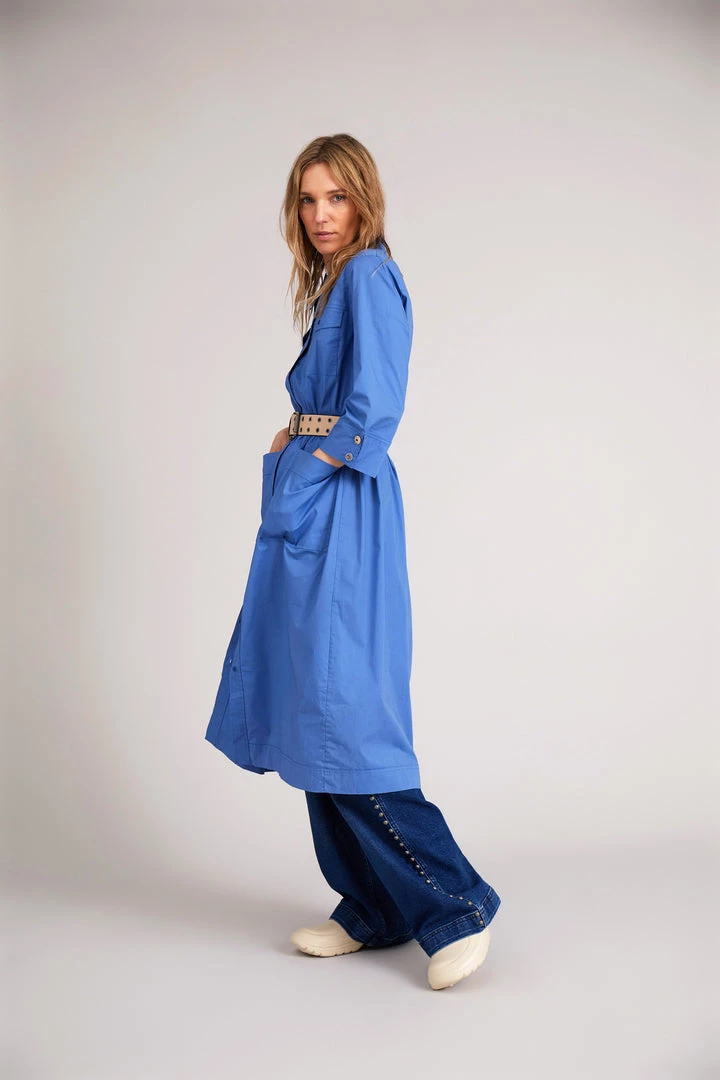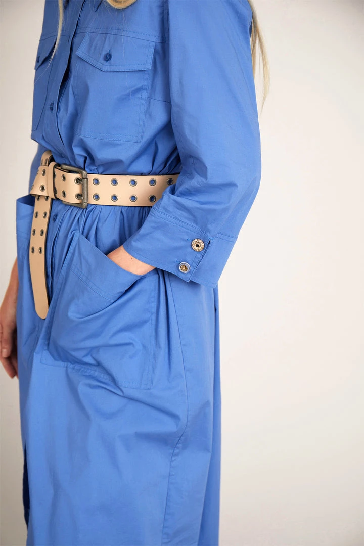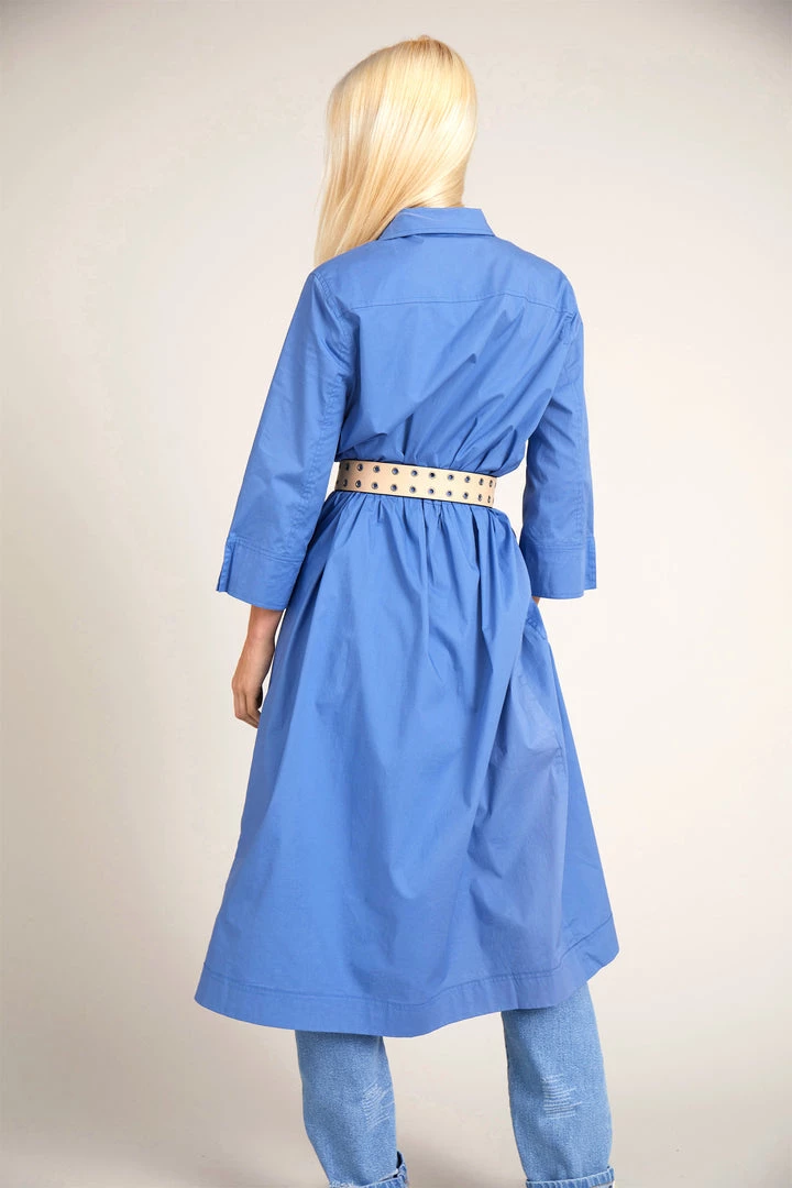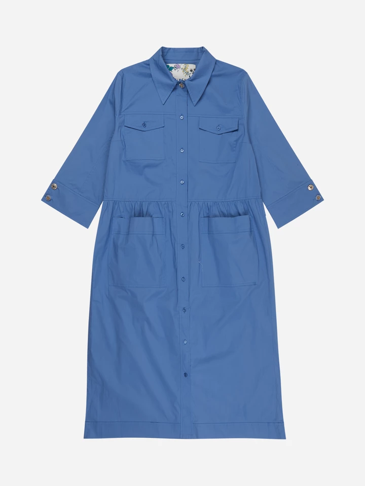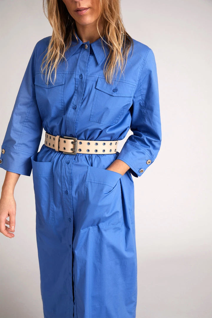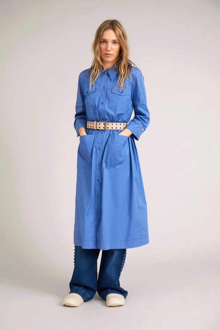 Midi-length shirt dress in organic cotton. The dress has three-quarter length sleeves with wide cuffs, deco buttons, regular collar, button closure and pockets at the front. Regular fit. Available in black and indigo.