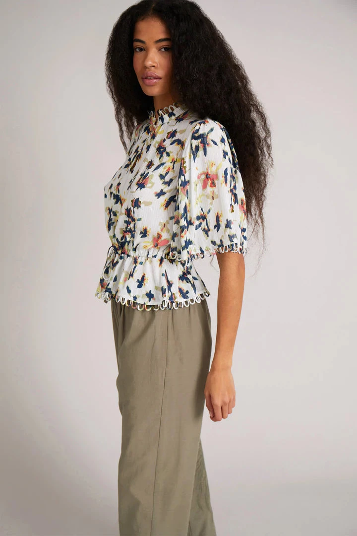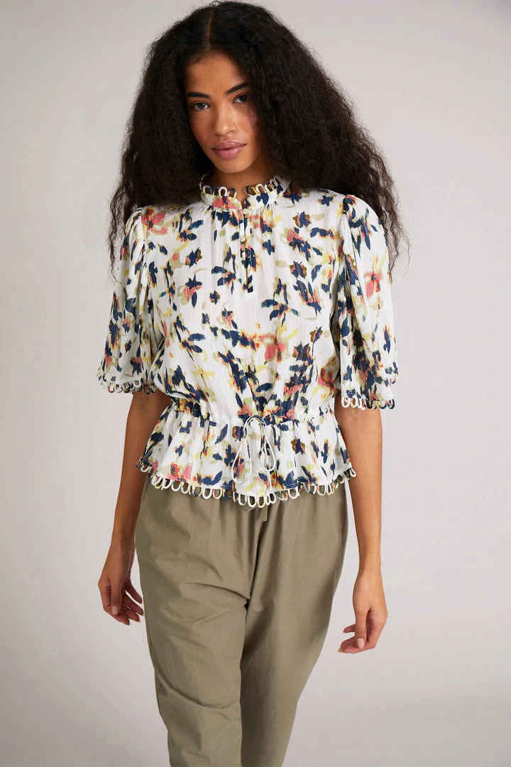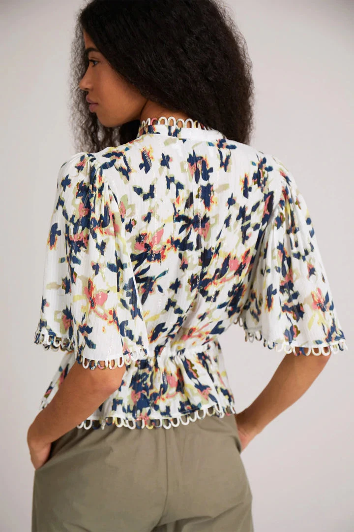 The top has a slit in the neck, rouleau details along the neckline, sleeves and at the bottom and a tie at the waist. Regular fit. Available in rose with a beautiful print and lurex details.