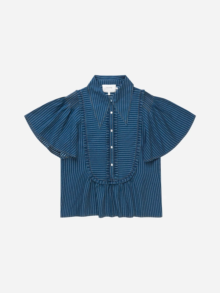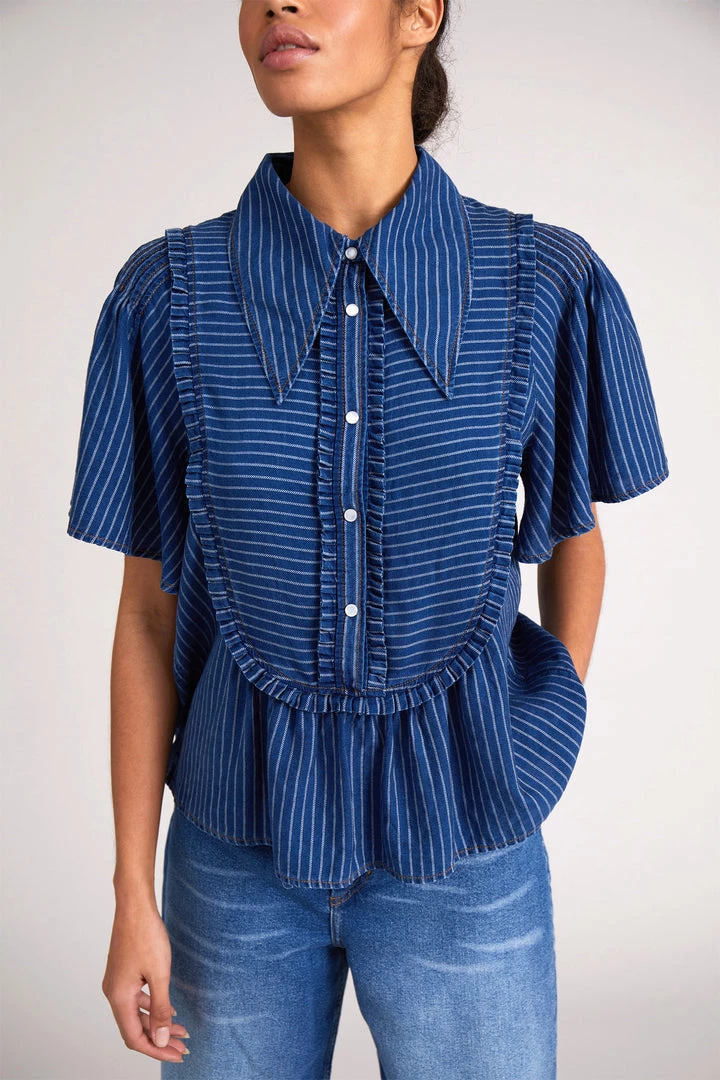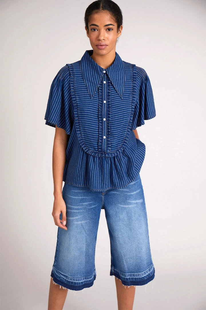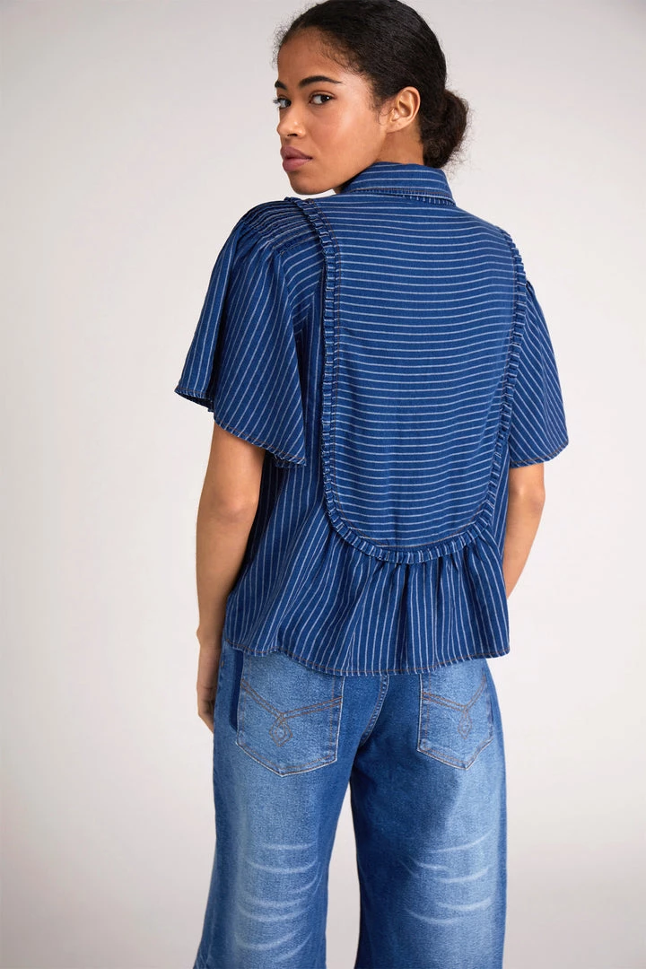 Feminine top with short, voluminous sleeves. The top has narrow shoulders, a sharp collar and placket with push buttons at the front. Frills along the placket, shoulders and back and front piece. Regular fit. Available in indigo with stripes.