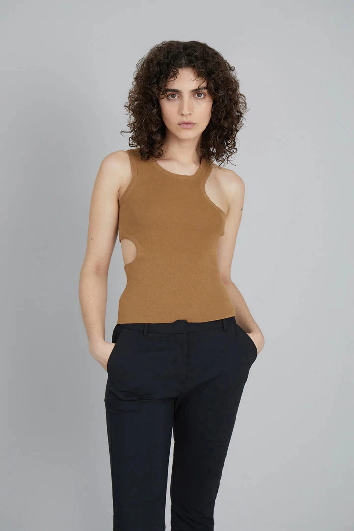 Tight knit tank top. The top is designed with an asymmetric neckline and armholes and a cutout detail at the right side.Â