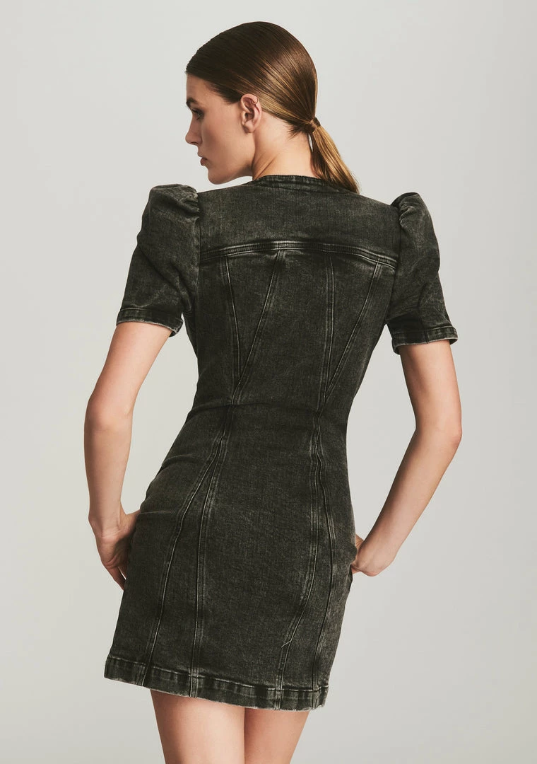 The Stasha Dress takes an edgy twist on a classic denim mini and is accented with lace-up stitching and puffed sleeves. The vintage-inspired wash is shown here in Obsidian Black.