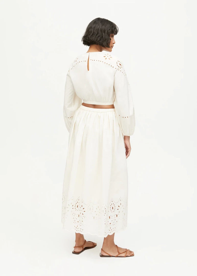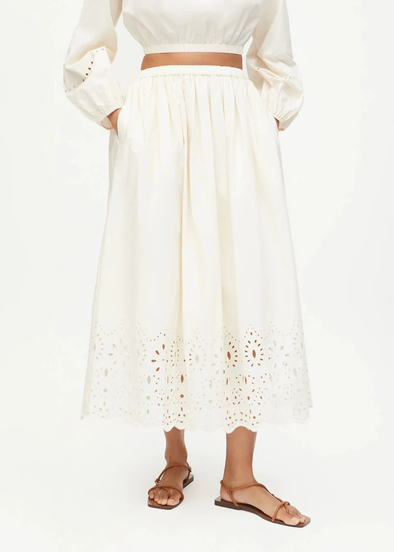 The Audrey Skirt is crafted from a crisp, comfortable cotton poplin in a full length that’s effortless to move in. With a flattering high waist and details towards the hem, it elongates your figure for maximum confidence. Subtle eyelet detailing and a piped scalloped hem make this a unique piece for warm weather seasons to come.