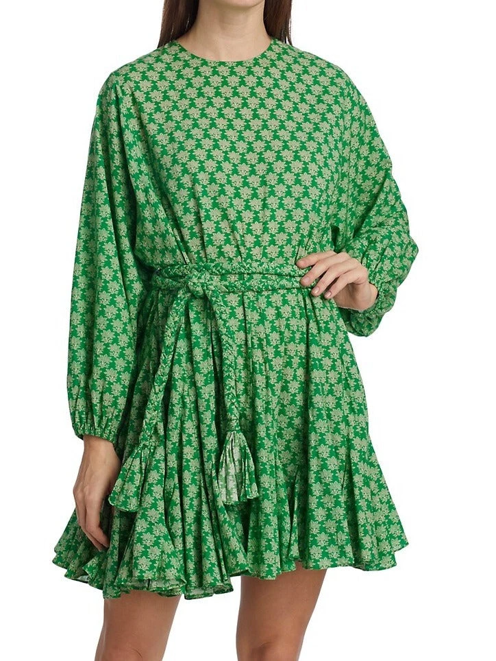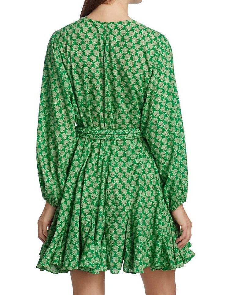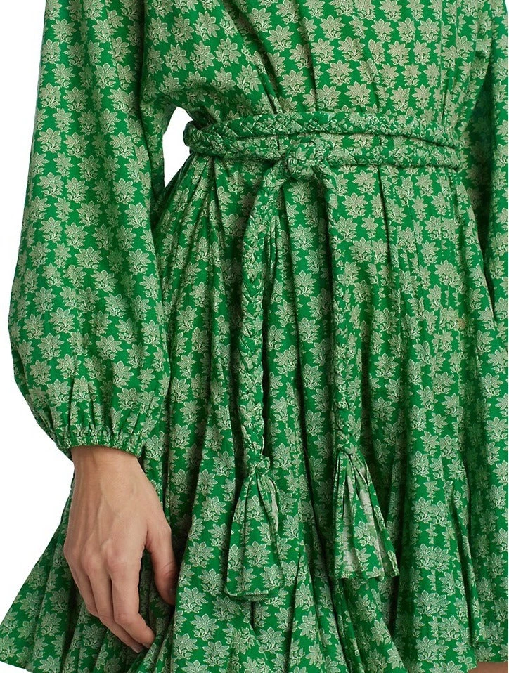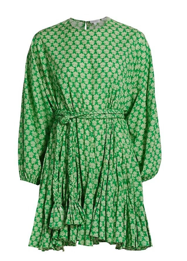 This printed mini dress is crafted of lightweight cotton and features a braided belt at the waist.