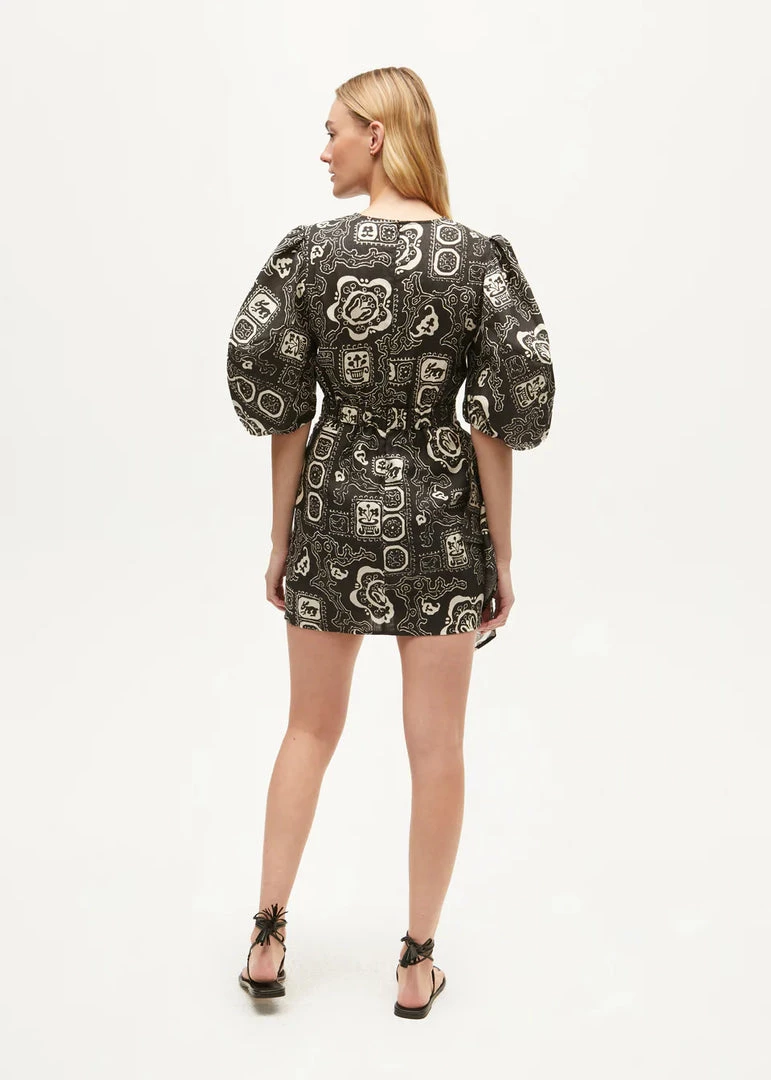The Pia features billowy short sleeves, a flattering waistband, and an elegant ruched asymmetric skirt which drapes into a waterfall ruffle. Inspired by ancestral Indian motifs, Bapu Bazaar creates a worldly impression for a season of exploration.