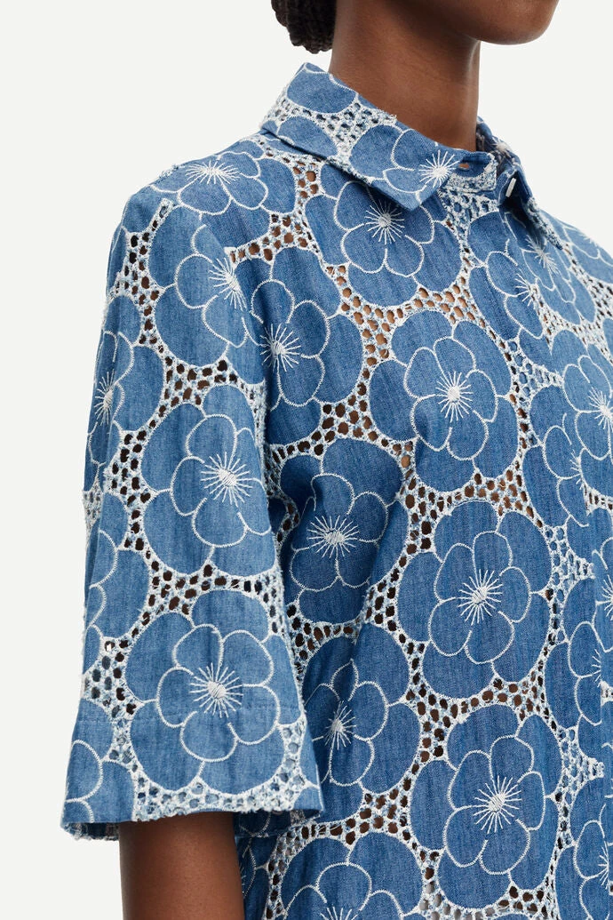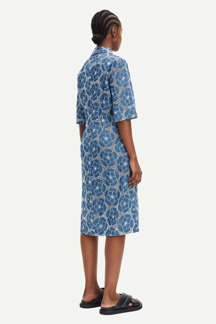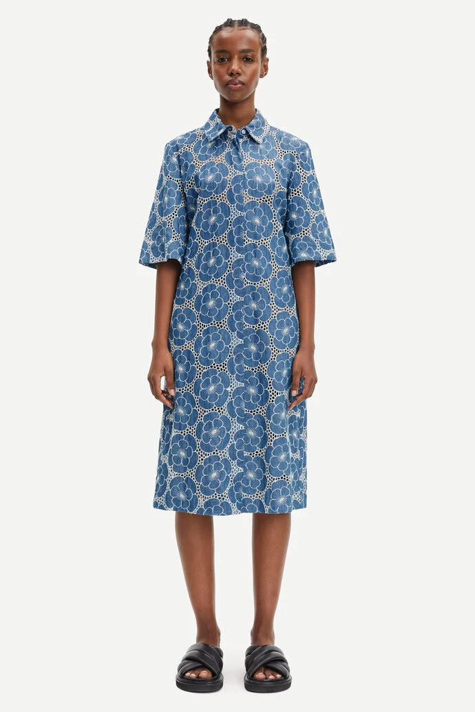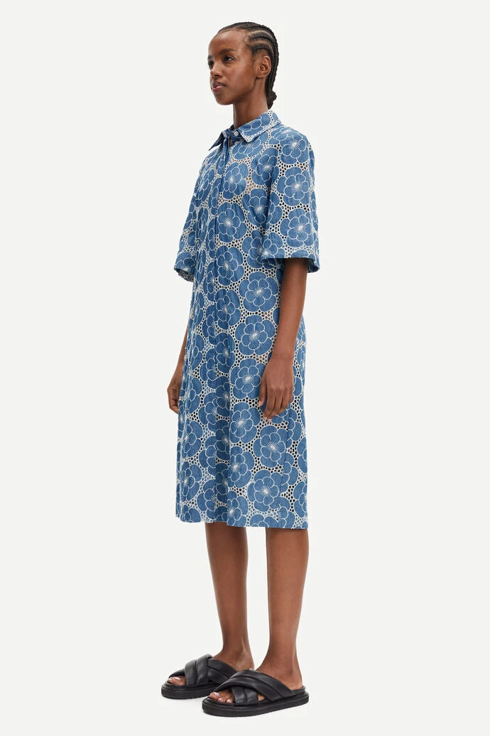 Slim fitting shirt dress with short sleeves and wide cuffs. Pointed collar, button fastening center front, darted waist. 100% cotton fabric with broderie anglaise pattern.