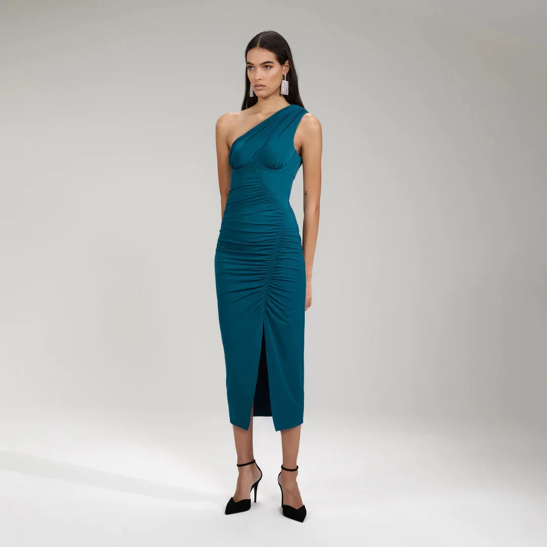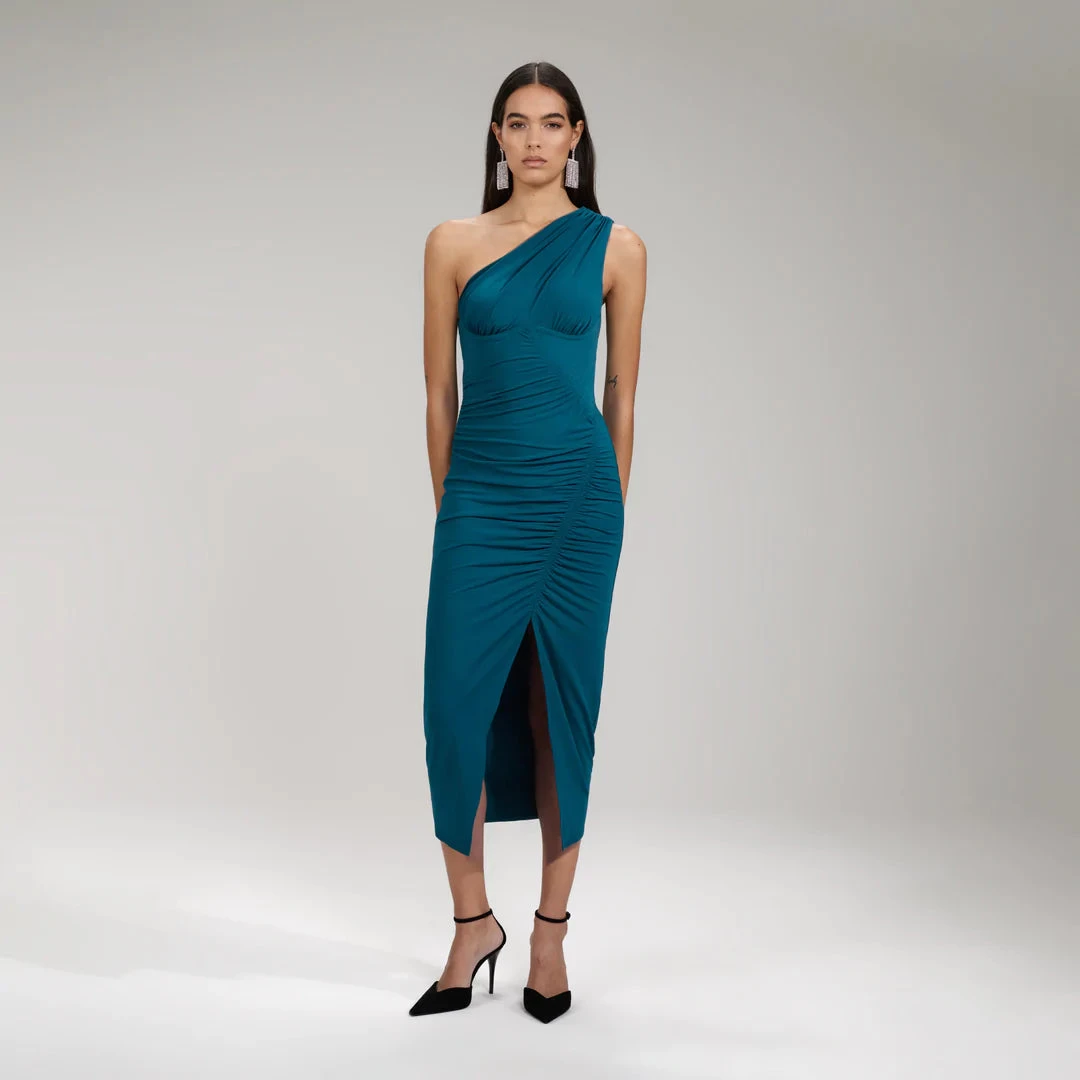 Couple a universally flattering jewel tone with a body-skimming fit and you’ve got a dress you’ll wear time and time again. This style features an asymmetric neckline and graphic cutout, mirroring a sultry front split. Cut from heavy jersey and gathered throughout for snug yet easy wearability — perfect for your next gala dinner or gathering.