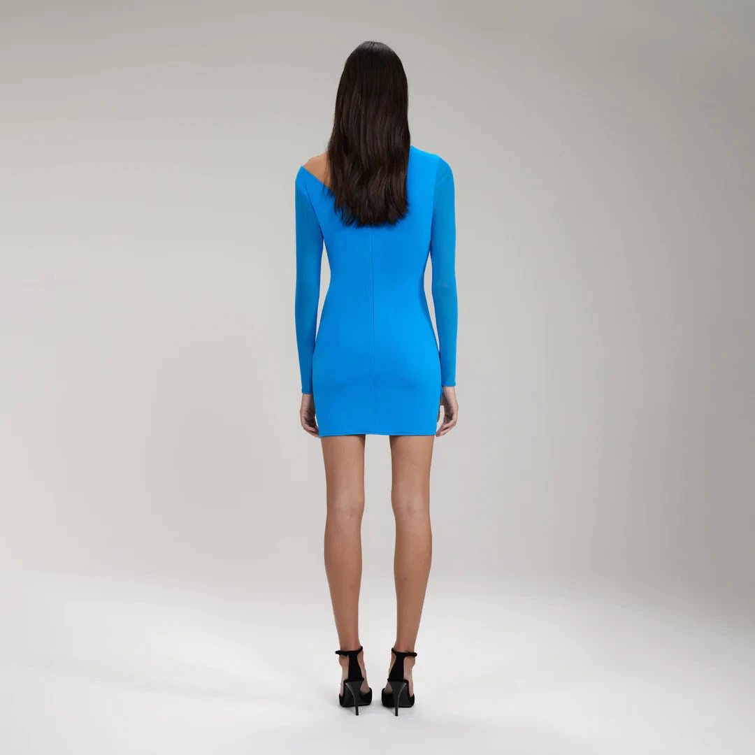 This vivid blue mini dress is cut from drapey jersey. It is designed with a flattering asymmetric off shoulder neckline and gathering through the dress. It falls to a fitted silhouette.