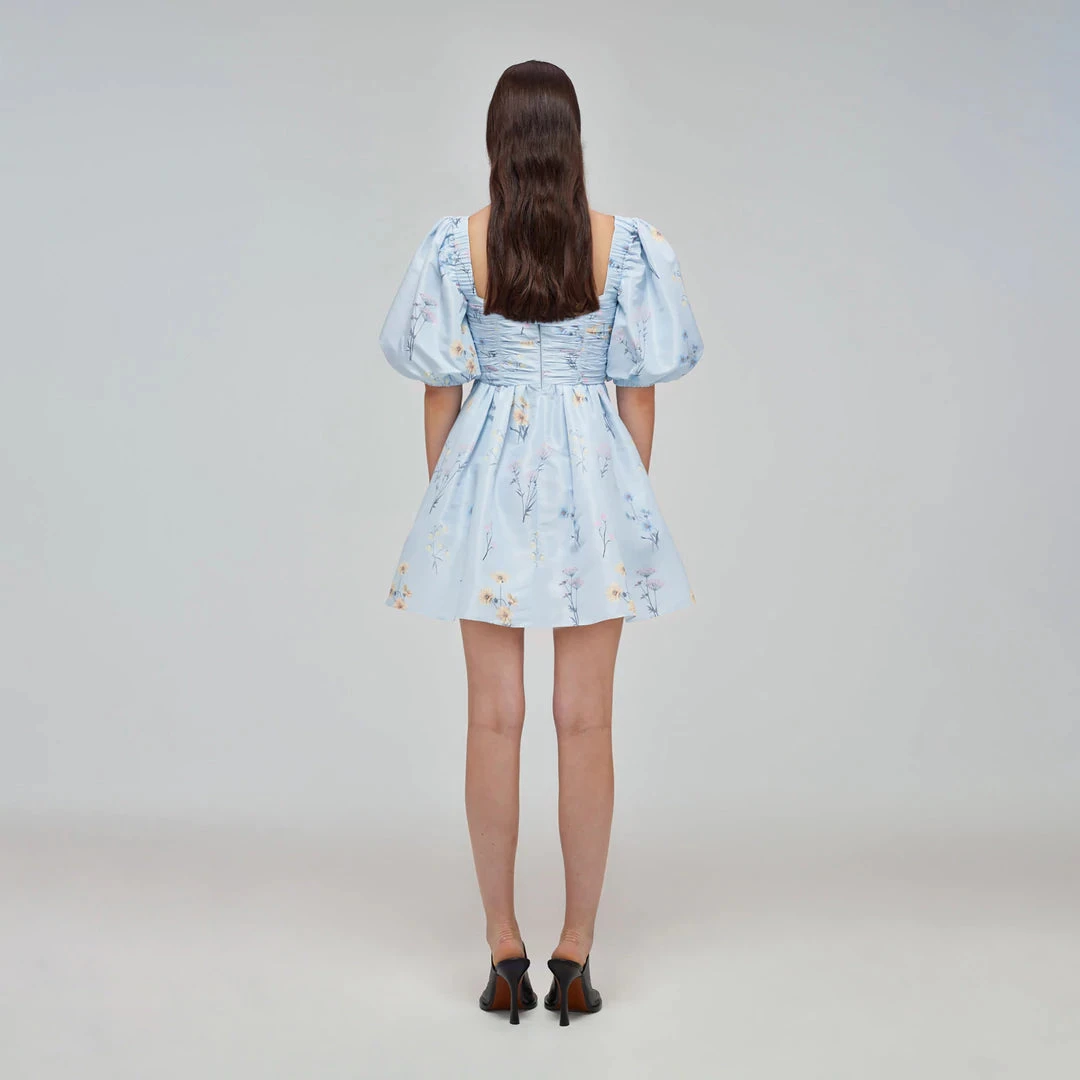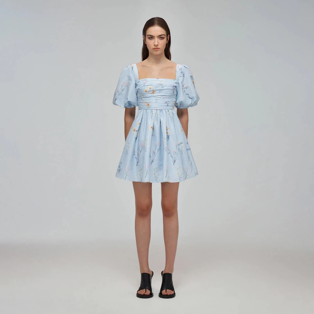 This mini dress is cut from floral watercolor taffeta. Designed with a flattering square neckline and statement puff sleeves. Fitted with an elasticated waist it falls to a full mini skirt. This style is lined with pockets.