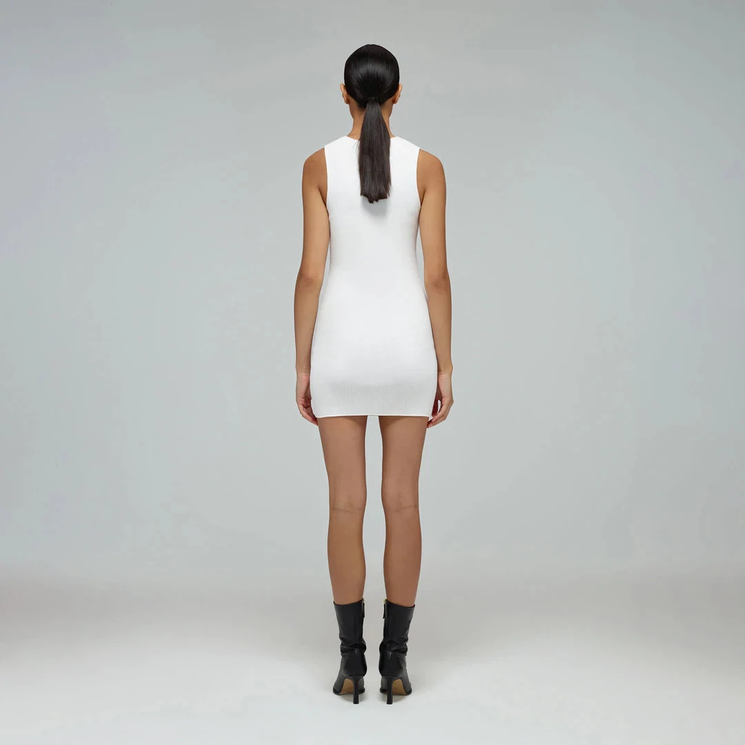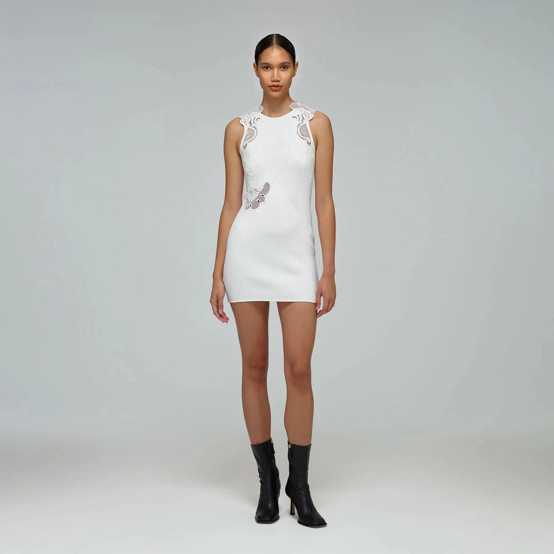 This ivory ribbed knit mini dress is designed with inserted lace trims. It is fitted to a slim silhouette and falls to a mini length.