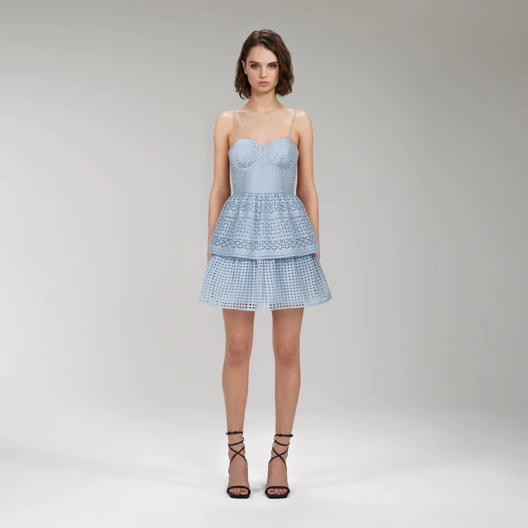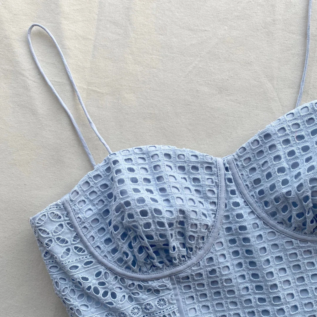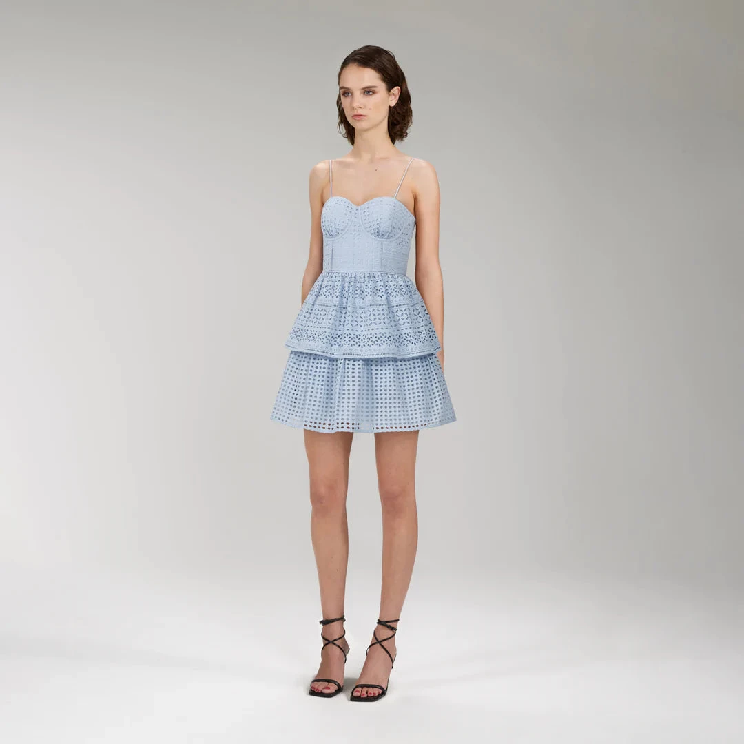 With its sculpting bodice and tiered mini skirt, this baby blue broderie anglaise number was designed to be a seasonal classic. Spaghetti straps keep everything in place and wired cups provide extra support. Go monochrome and layer it under a light wash denim jacket at Sunday brunch, and style it simply with strappy sandals on your next seaside escape.