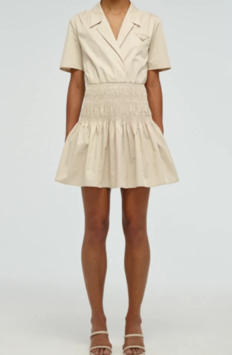 This beige mini dress is cut from organic cotton. It features large lapels and a front pocket detail. This style is fitted at the waist with shirring through the skirt. This style is unlined.
