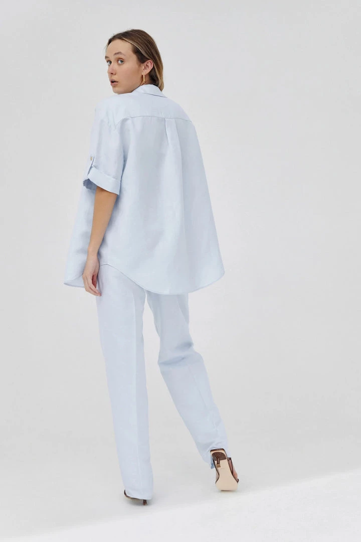 Crafted from a linen blend fabrication, the Ophelia Pant in a dreamy Powder Blue colour way are perfect for everyday styling. High waist fit, functional inseam pockets, fully lined and front fly opening. A must have style this season ~ pair with slides or white sneakers for a complete look.