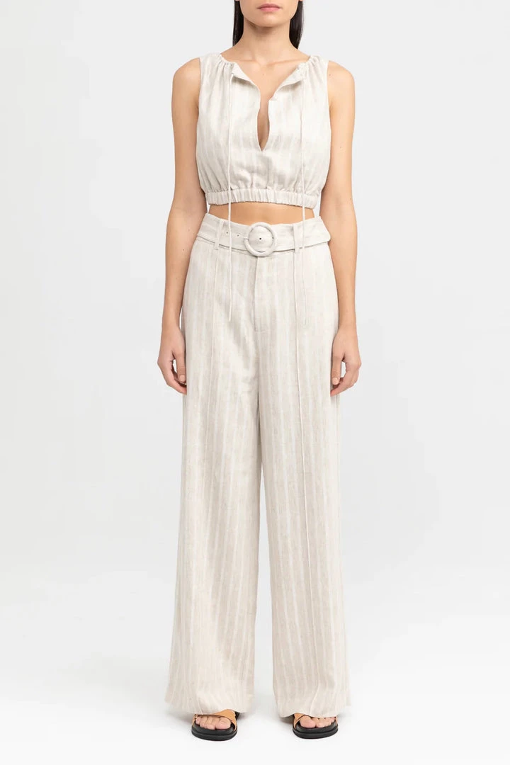 Crafted from a key linen fabrication, the Zola Pant in Natural Stripe will be a key part of your capsule wardrobe. Designed to be fitted at the waist and relaxed toward the hem, this easy wear style features inseam pockets, adjustable belt and front fly closure. Pair with the Stephanie Top for a complete look.