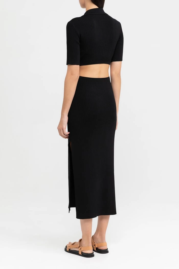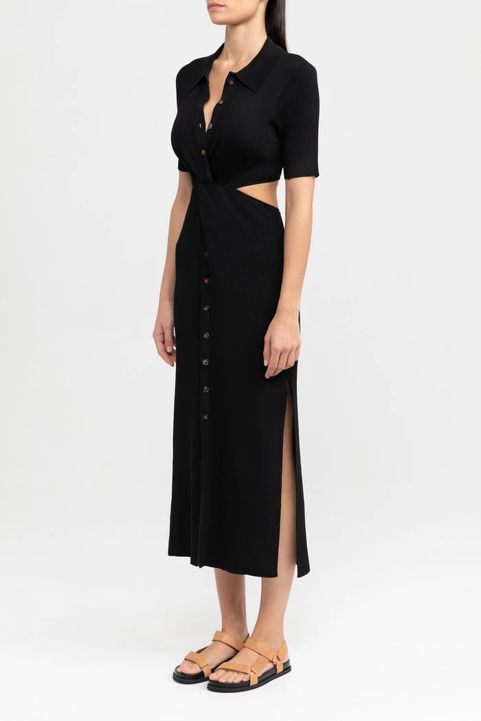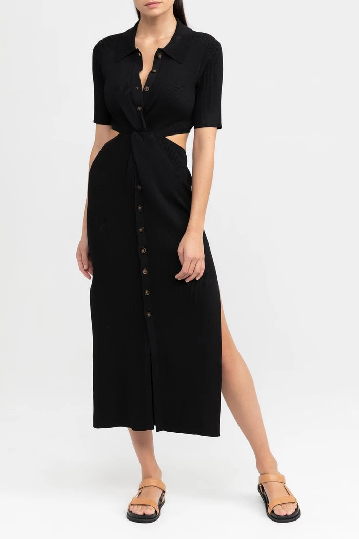 Crafted from our luxe ribbed knit fabrication, the Delta Knit Dress in Black is designed to be fitted at the bodice and relaxed toward the hem. Button front closure, cut out detail at the waist and t-shirt style sleeves. Pair with white sneakers of slides for an everyday look.