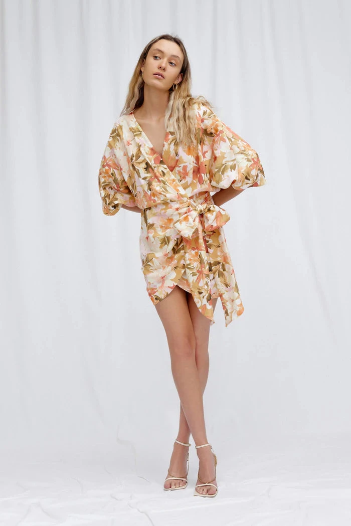 Bolder prints compliment neutral tones this season ~ the Kenna Dress in Watercolor Floral is the perfect addition to your wardrobe. Crafted from a relaxed linen blend fabrication, this style features accentuated sleeves, plunging neckline, wrap front closure and adjustable tie at the waist.