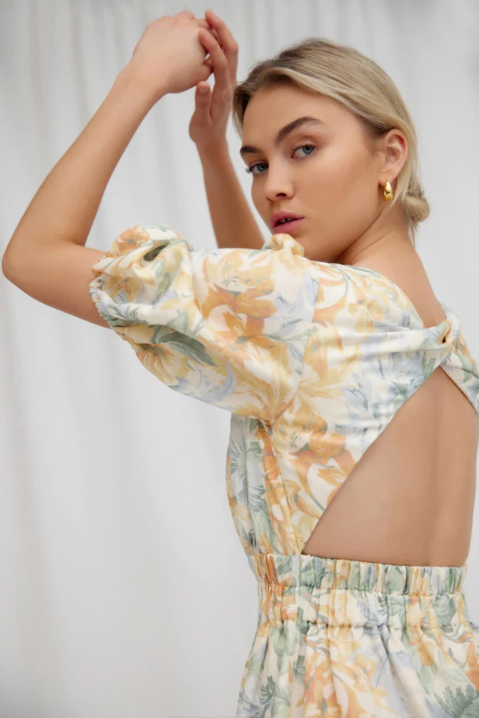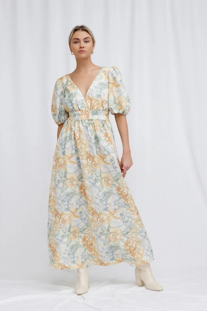 Crafted from a versatile linen blend fabrication, the Elina Dress in Island Bouquet is designed to be fitted at the waist and relaxed throughout. Accentuated balloon sleeves, plunging neckline and elasticated waistband for added comfort.