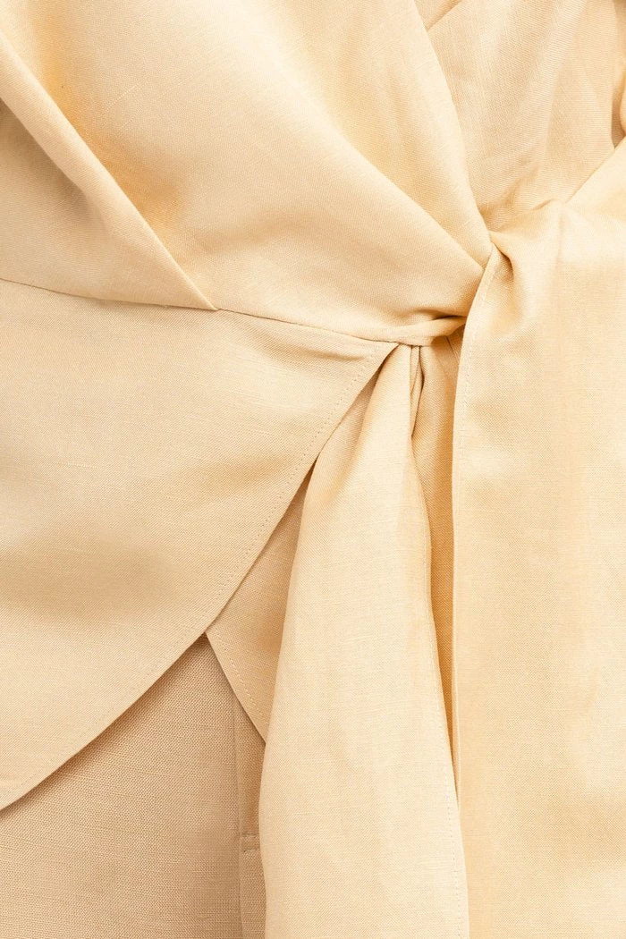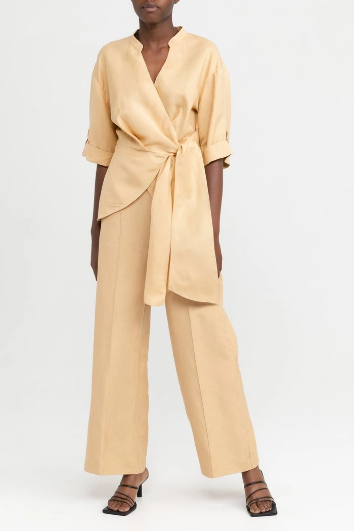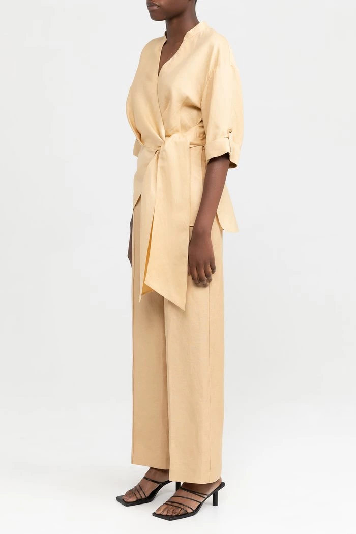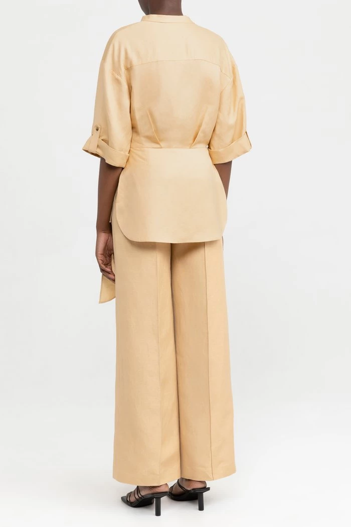 The perfect piece to pair back in your wardrobe ~ the Florina Shirt in Biscuit is elevated with fresh design features ~ plunging neckline, elbow length sleeves and tie detail at the waist. Perfect for tucking.