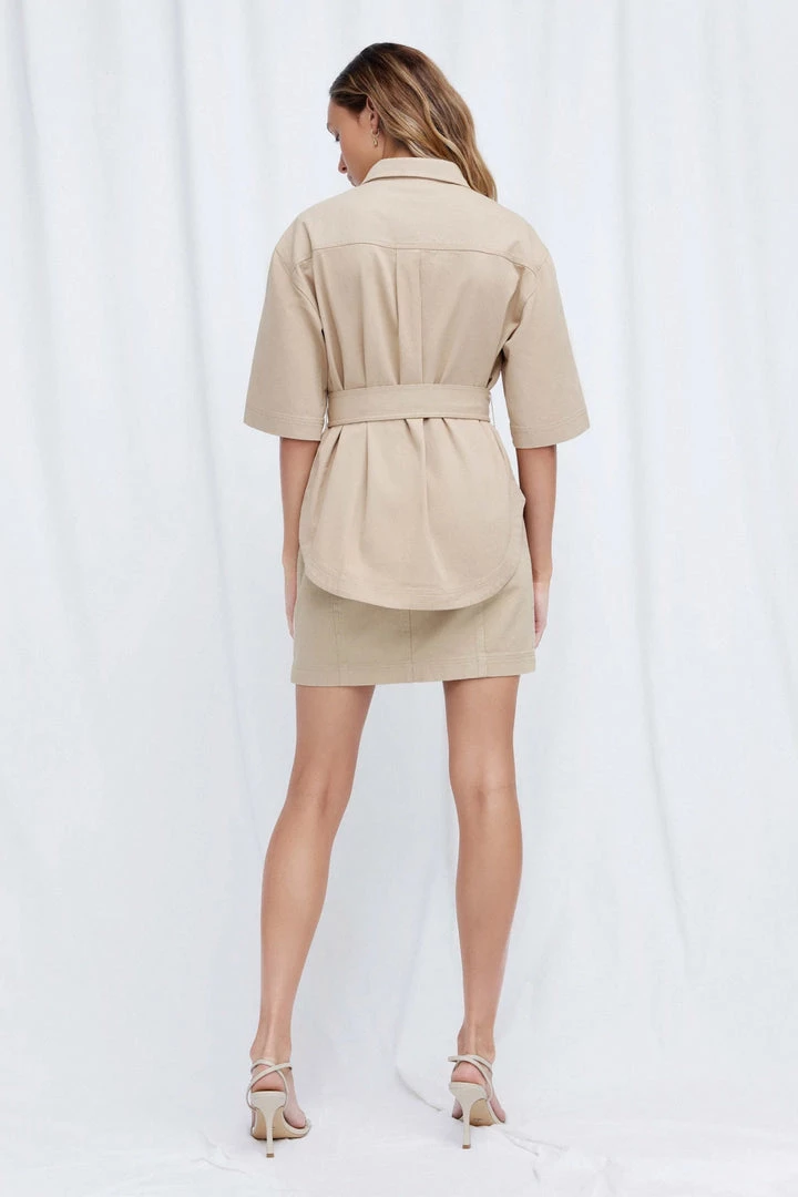 A staple color palette ~ the Regina Shirt in Washed Almond is crafted from a structured cotton fabrication. Featuring playful cut out detail, pebble shaped buttons, collared neckline and adjustable D-ring belt. Pair with the Regina Skirt in Washed Almond for a stand out double denim look.