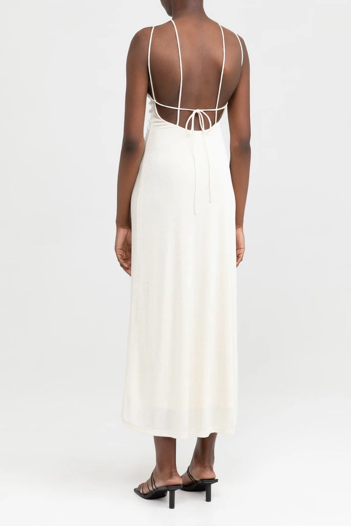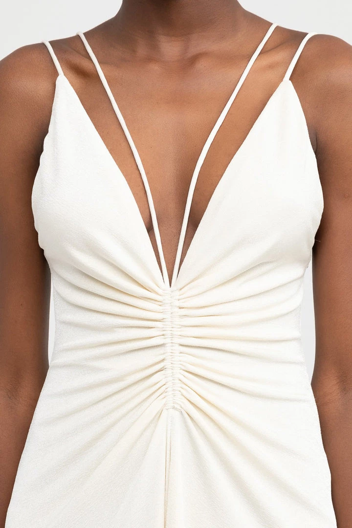 The Sassari Dress in Pearl is designed to be fitted at the bodice and relaxed toward the hem. Crafted from our luxurious jersey fabrication, key design elements create an elegant silhouette. Plunging neckline, gathered fabrication and adjustable back tie feature on this style.Â