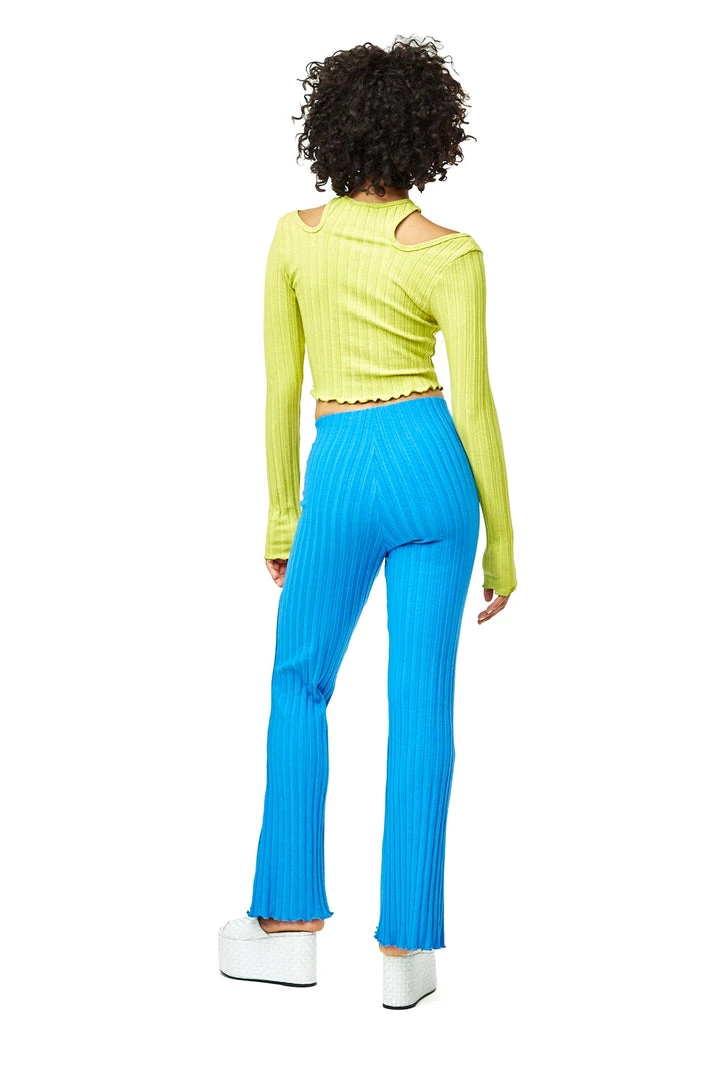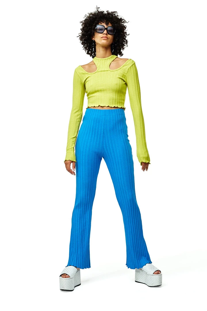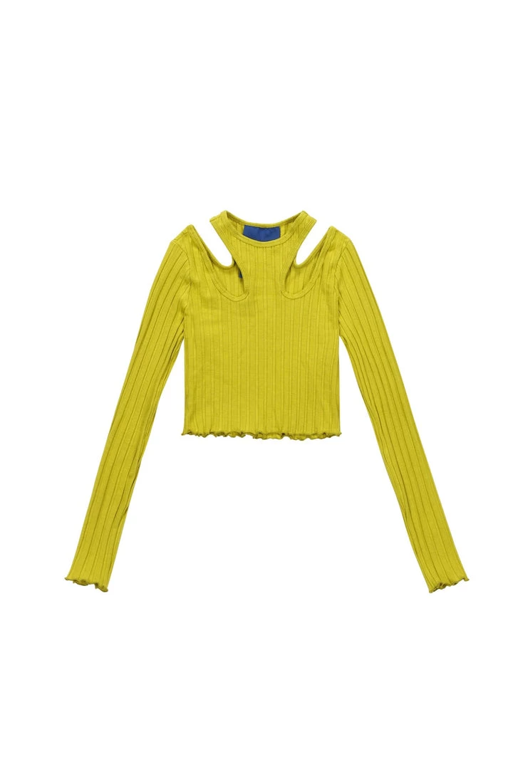 CROPPED LONG SLEEVE TOP WITH GEOMETRIC CUT OUT NECKLINE IN OUR IN CUSTOM SIMON MILLER RIB. 12X12 RIB OFFERS A WIDE RIB DISTINCT AESTHETIC. MADE FROM MICRO-MODAL AND KNOWN FOR ITS SOFTNESS AND MADE TO HOLD ITS SHAPE. MACHINE WASH COLD. TUMBLE DRY LOW. DO NOT BLEACH. DO NOT DRY CLEAN. DO NOT IRON.