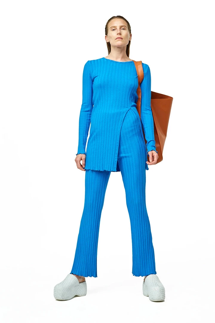 Mid rise skinny pull on pant in custom Simon Miller rib. 12×12 rib offers a wide rib distinct aesthetic. Made from micro-modal and known for its softness and made to hold its shape.