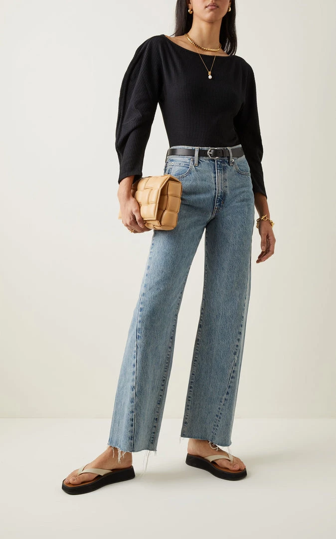 Made of organic cotton, these light wash ‘Grace’ jeans have a wide-leg silhouette and feature a twisted seam along the sides. Pair with a tucked in blouse and sandals for a cool casual look.