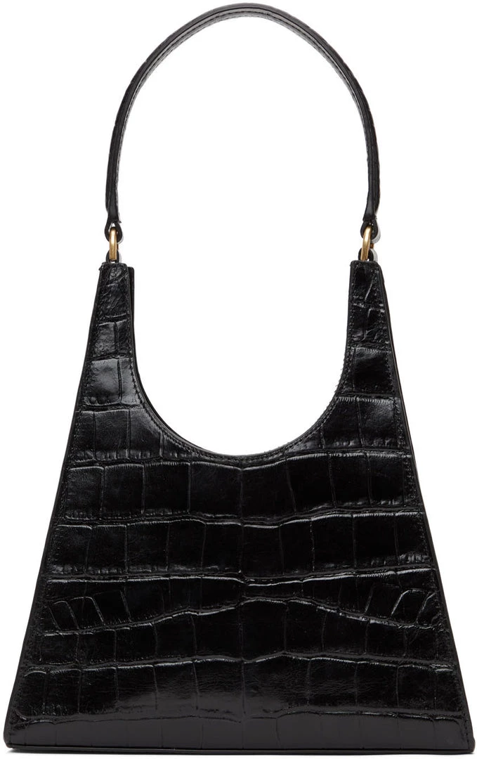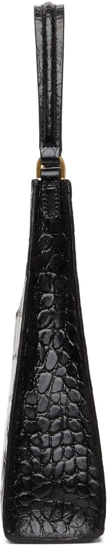 Croc-embossed calfskin shoulder bag in black. Carry handle at top. Magnetic press-stud tab fastening featuring embossed logo at throat. Zippered pocket and leather logo patch at interior. Tonal suede lining. Gold-tone hardware. Approx. 10.25″ length x 6.5″ height x 3″ width.
