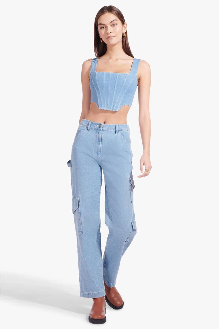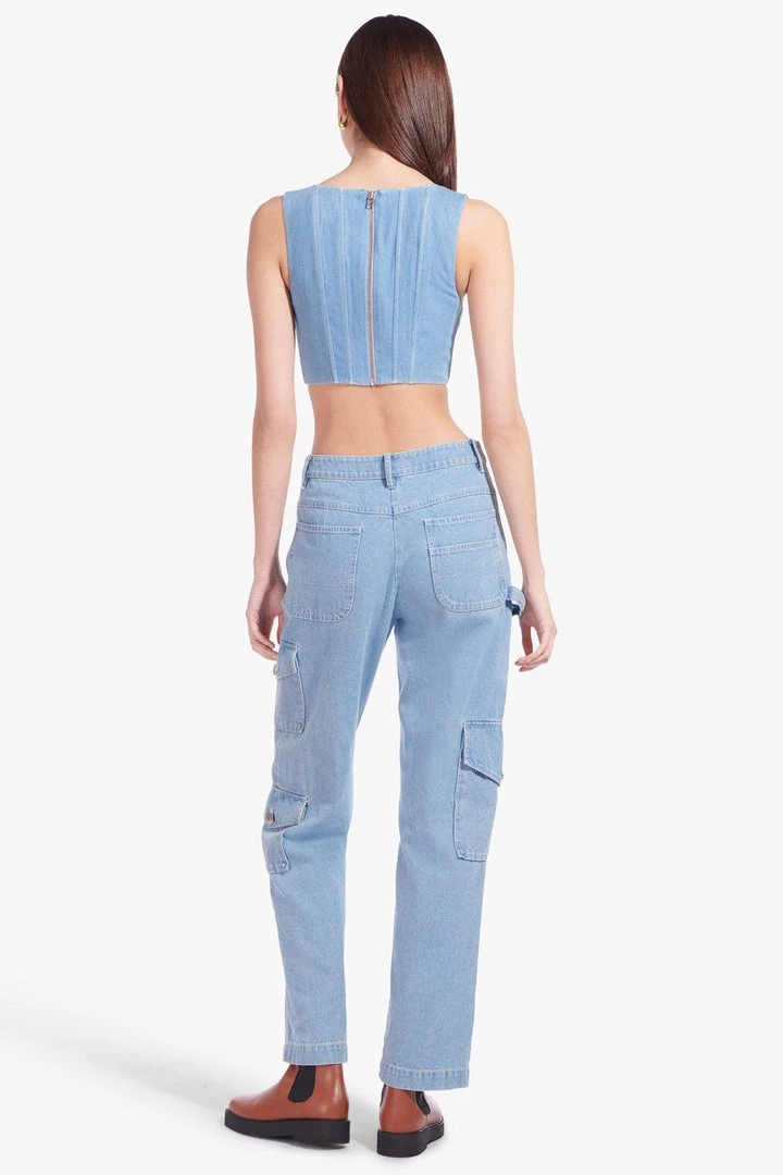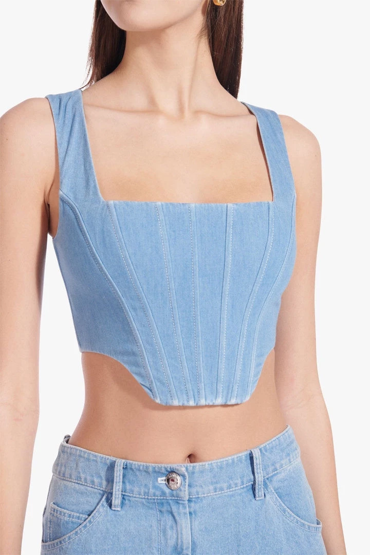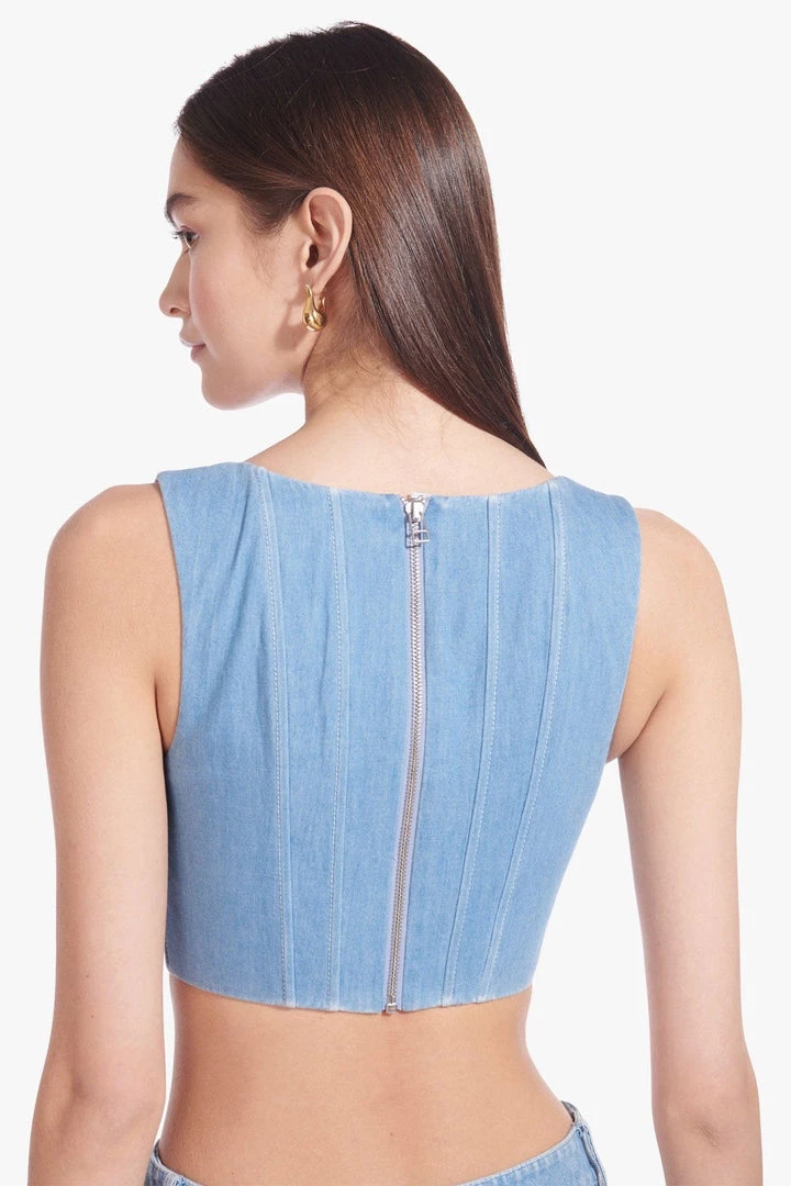 Our cropped corset-style top update in a light wash denim. The Alice Top features structured panels and a back zipper. This style completes a matching look with the Easton Pant and can be topped with the Truckee Jacket.