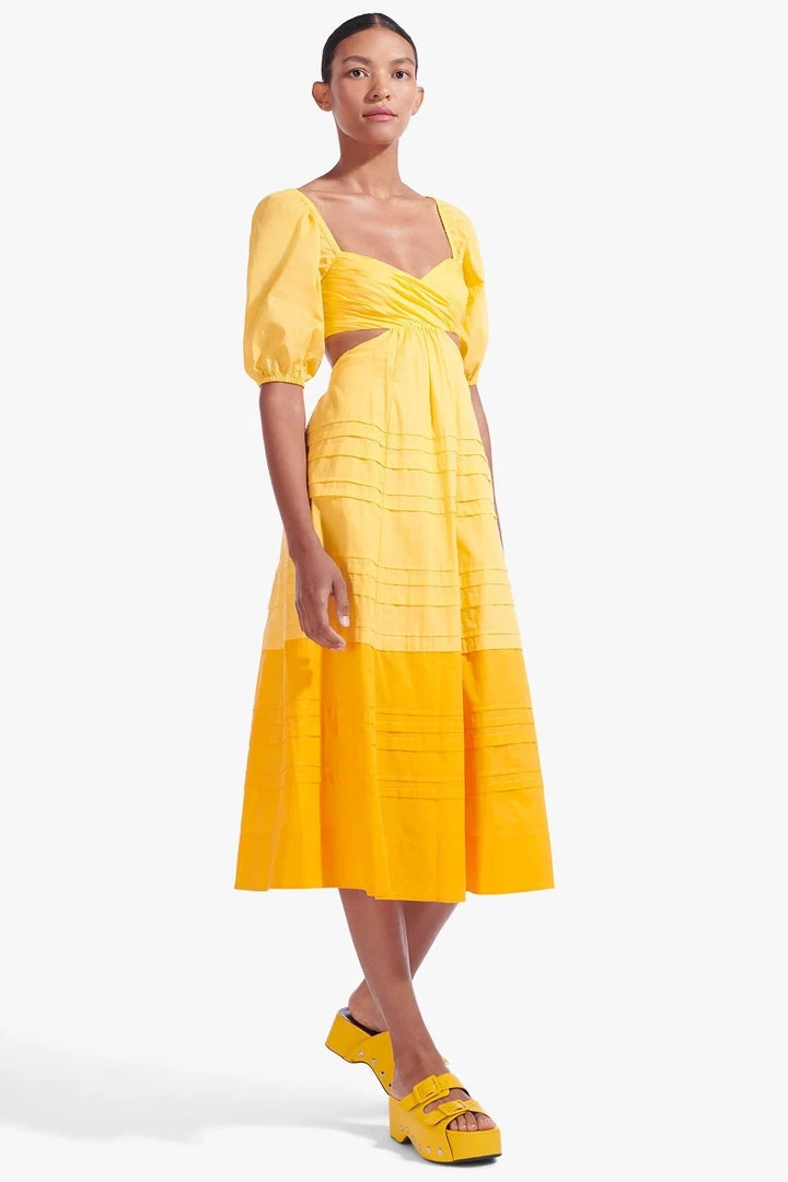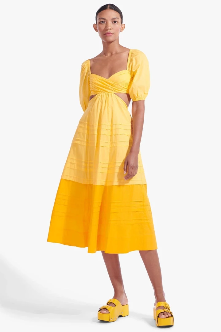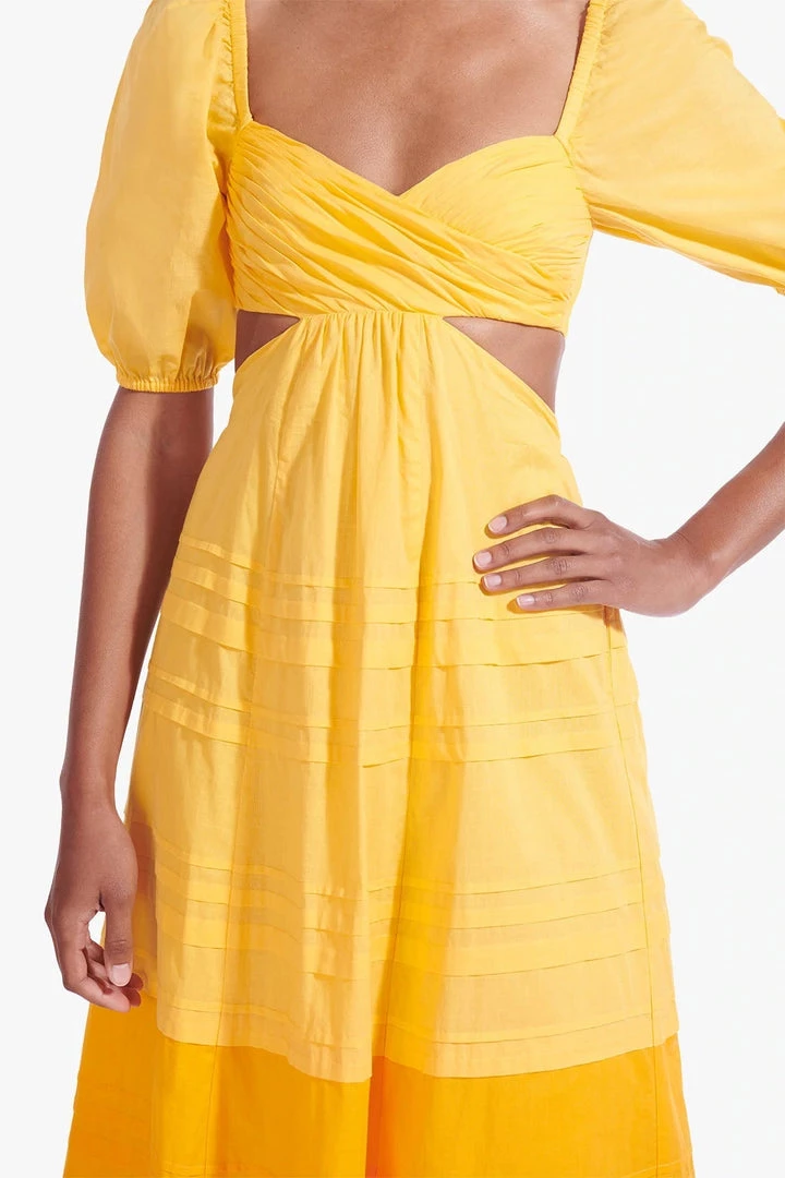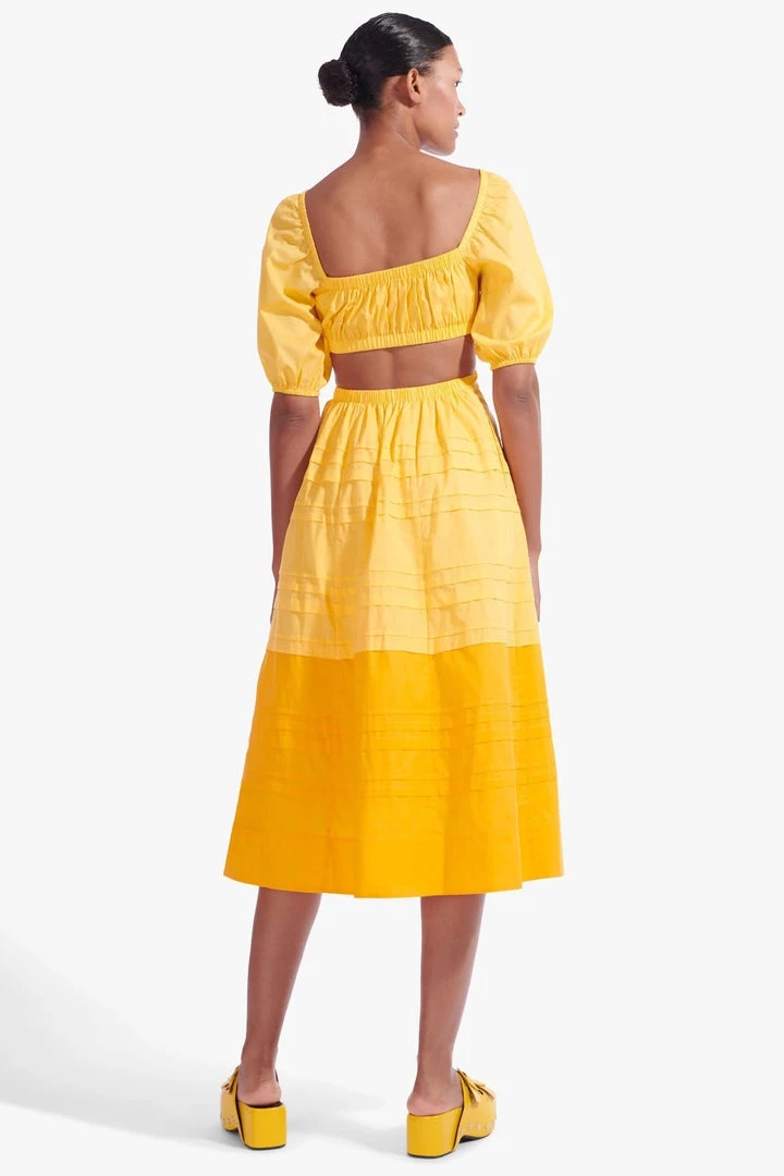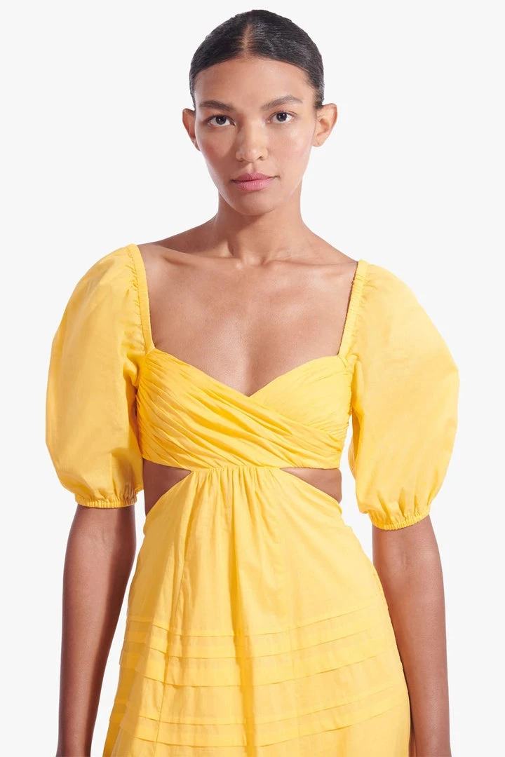 The Carina Dress is a midi-length cotton poplin dress with delicate pintuck details. This style features an overlapped pintuck bodice with underbust to back cutout details.