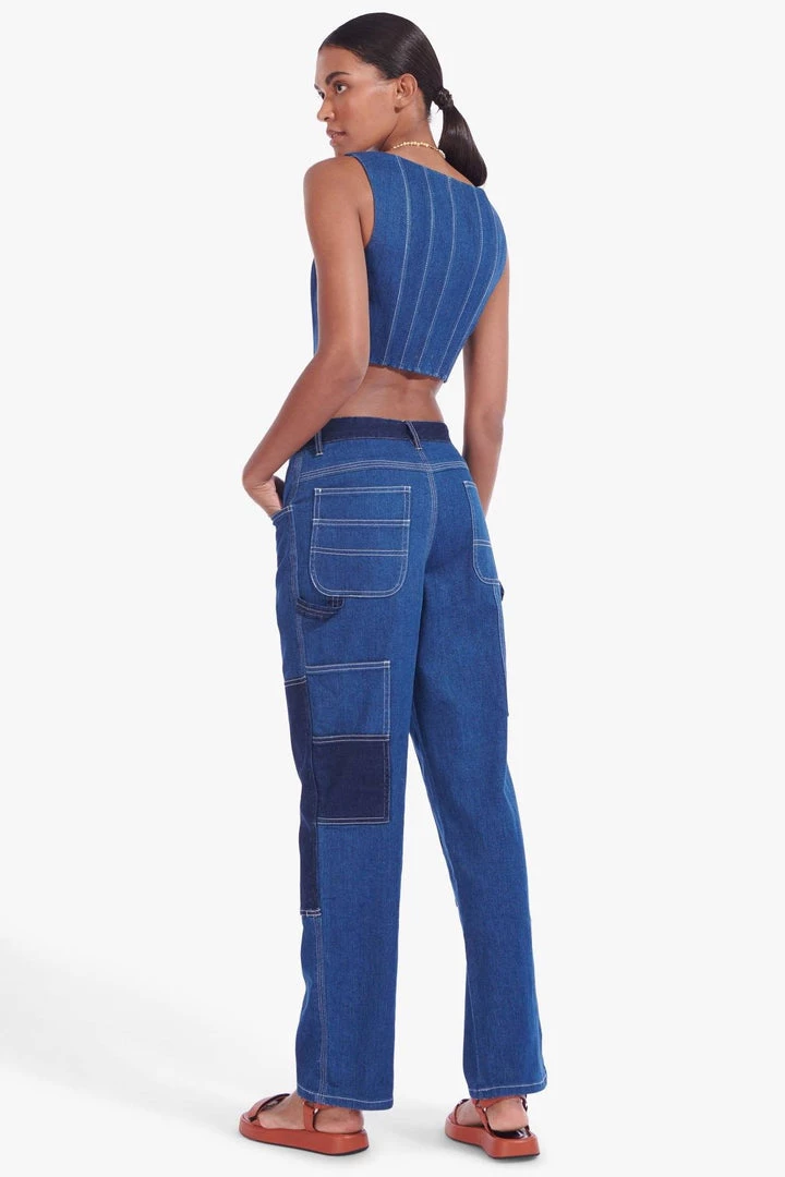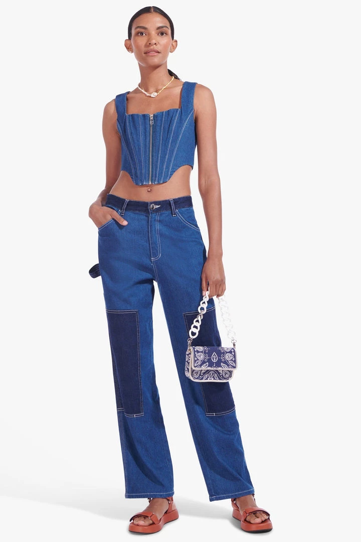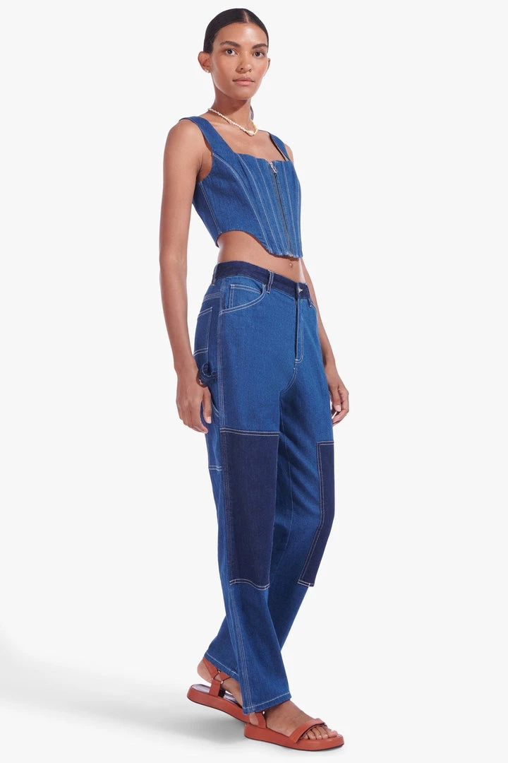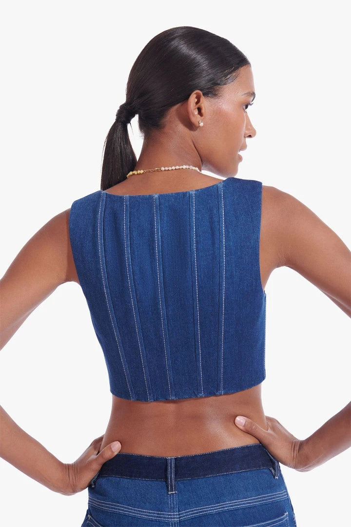 The Cindy Top is a cropped, corset-style top. Constructed out of a stretch denim fabric, this style features structured panels, white contrast top stitching and a zipper down the front.