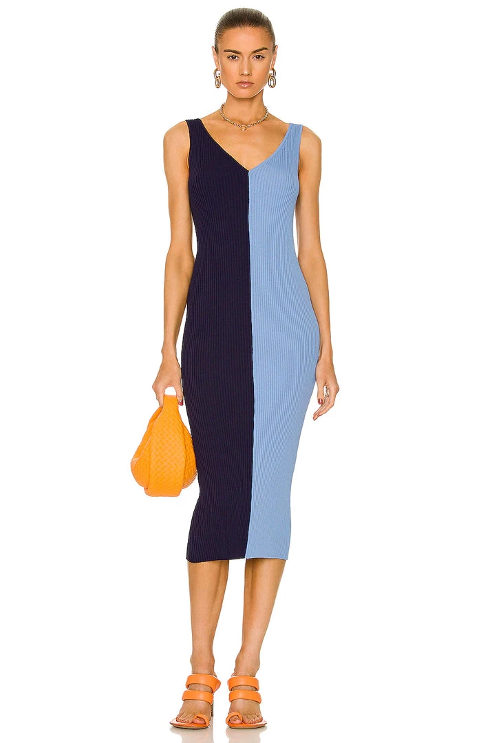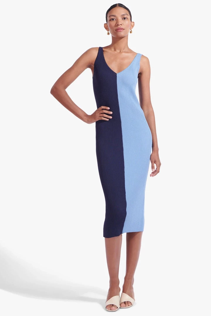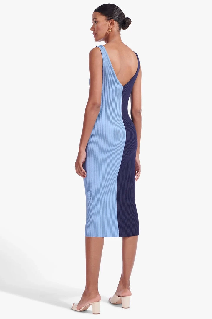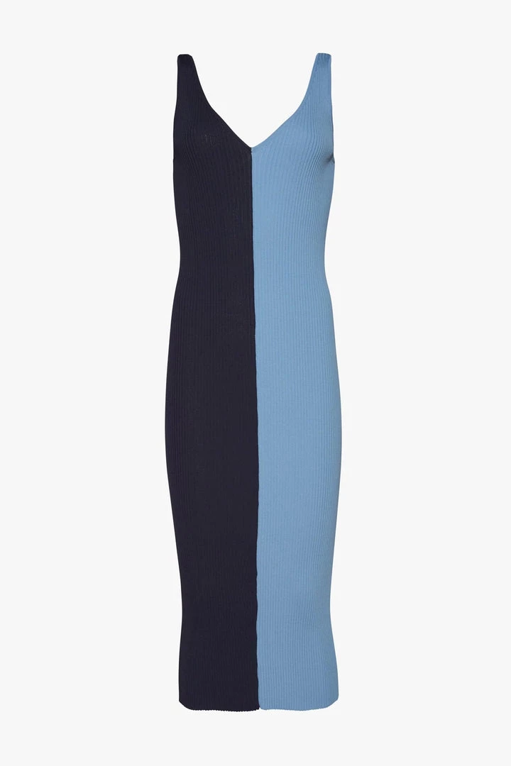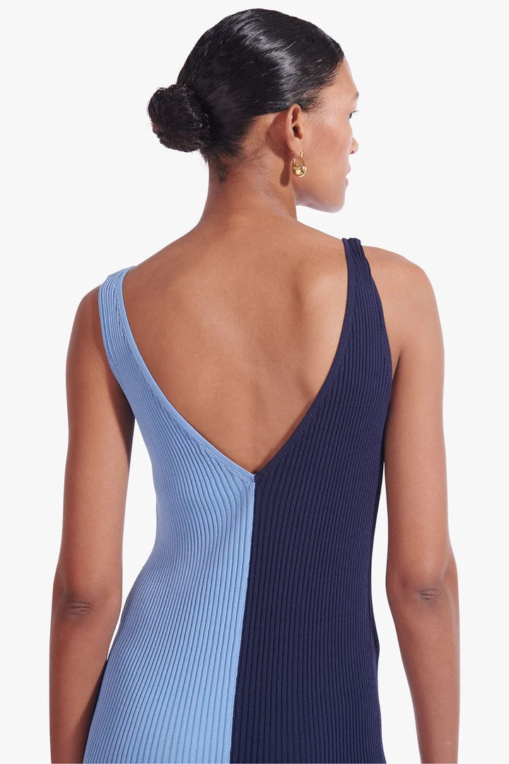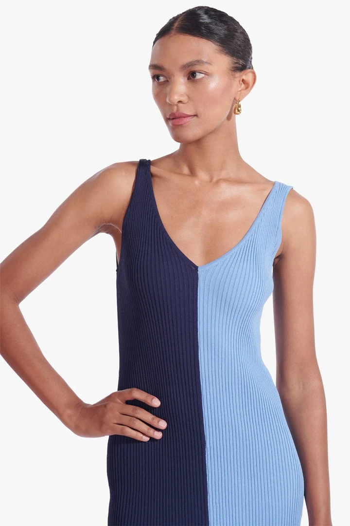 The Dana Dress is a two-toned sleeveless dress constructed out of Staud’s signature compact ribbed knit fabric. This style pairs perfectly with sneakers and heels to create your newest summer staple.Â