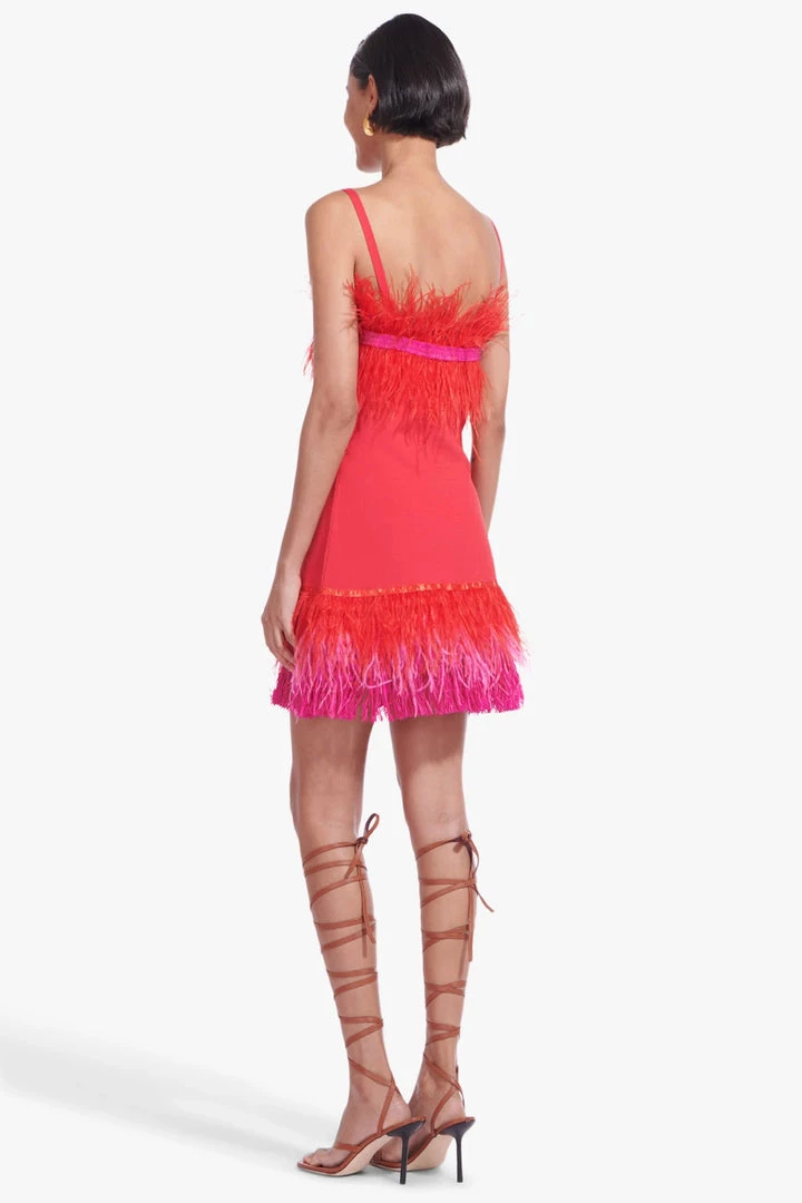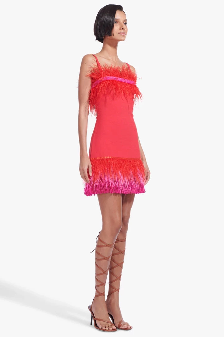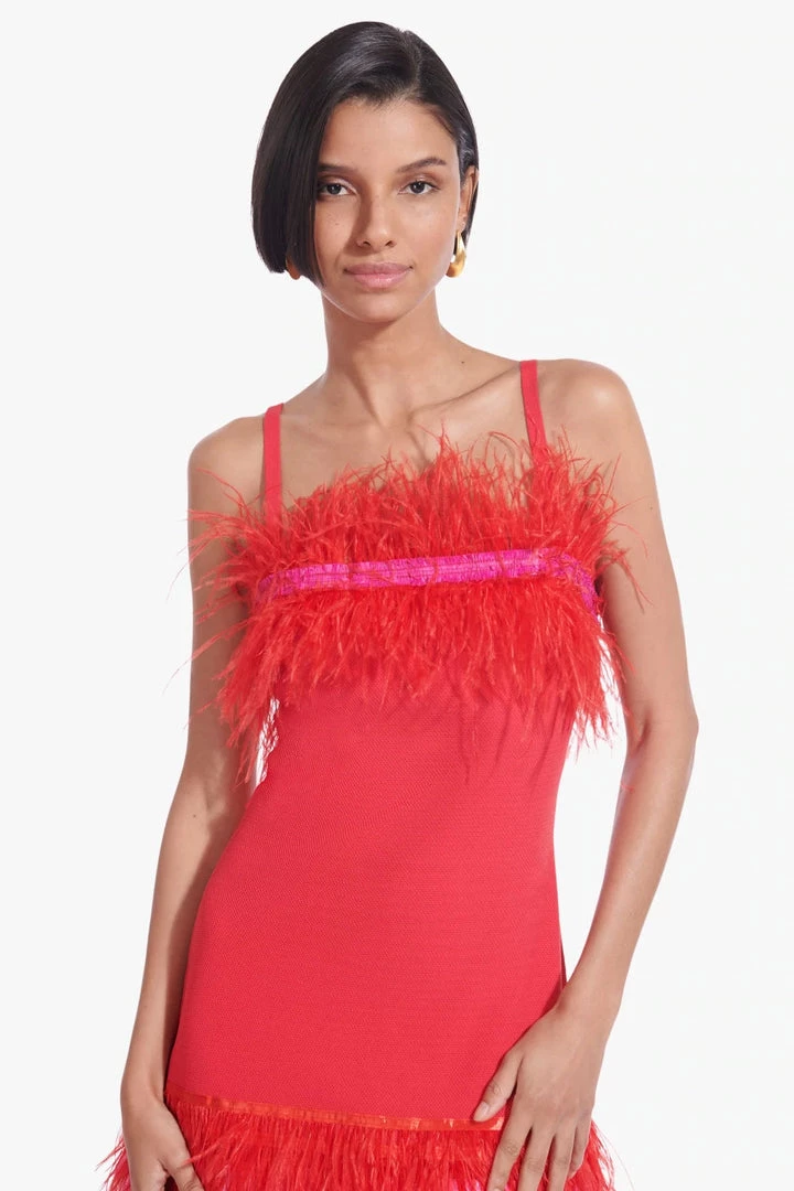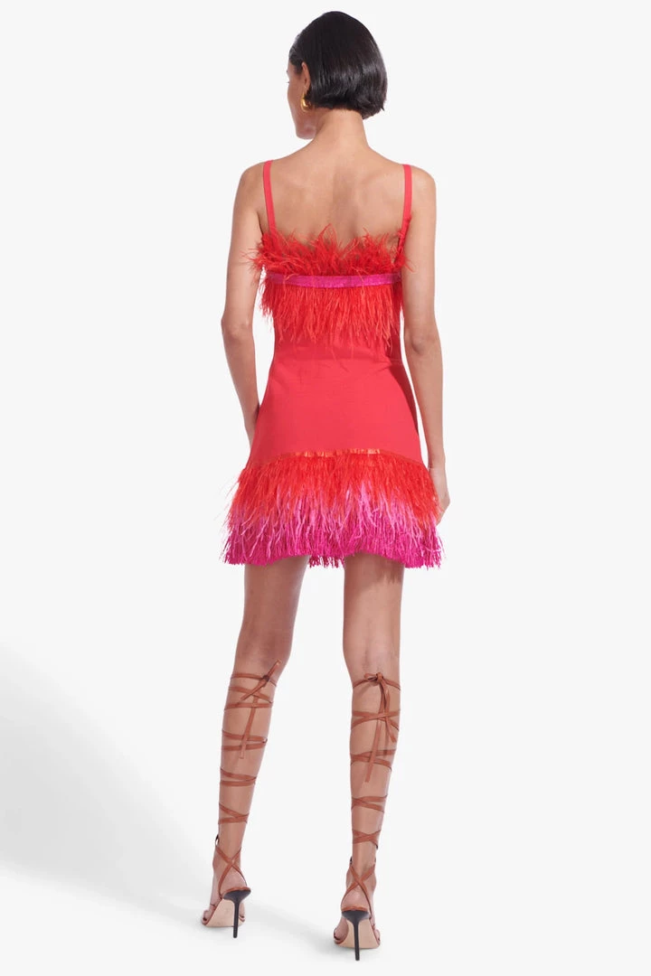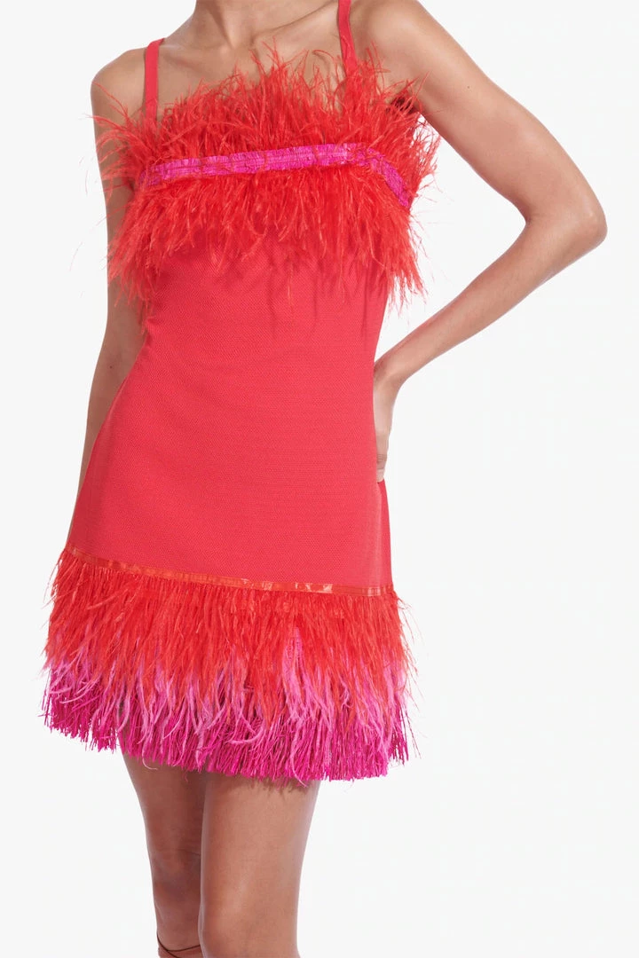 The Etta Dress is a new compact knit mini. This style features ostrich feathers and raffia fringe details at the neckline and hem. As seen on our Spring ’22 runway.